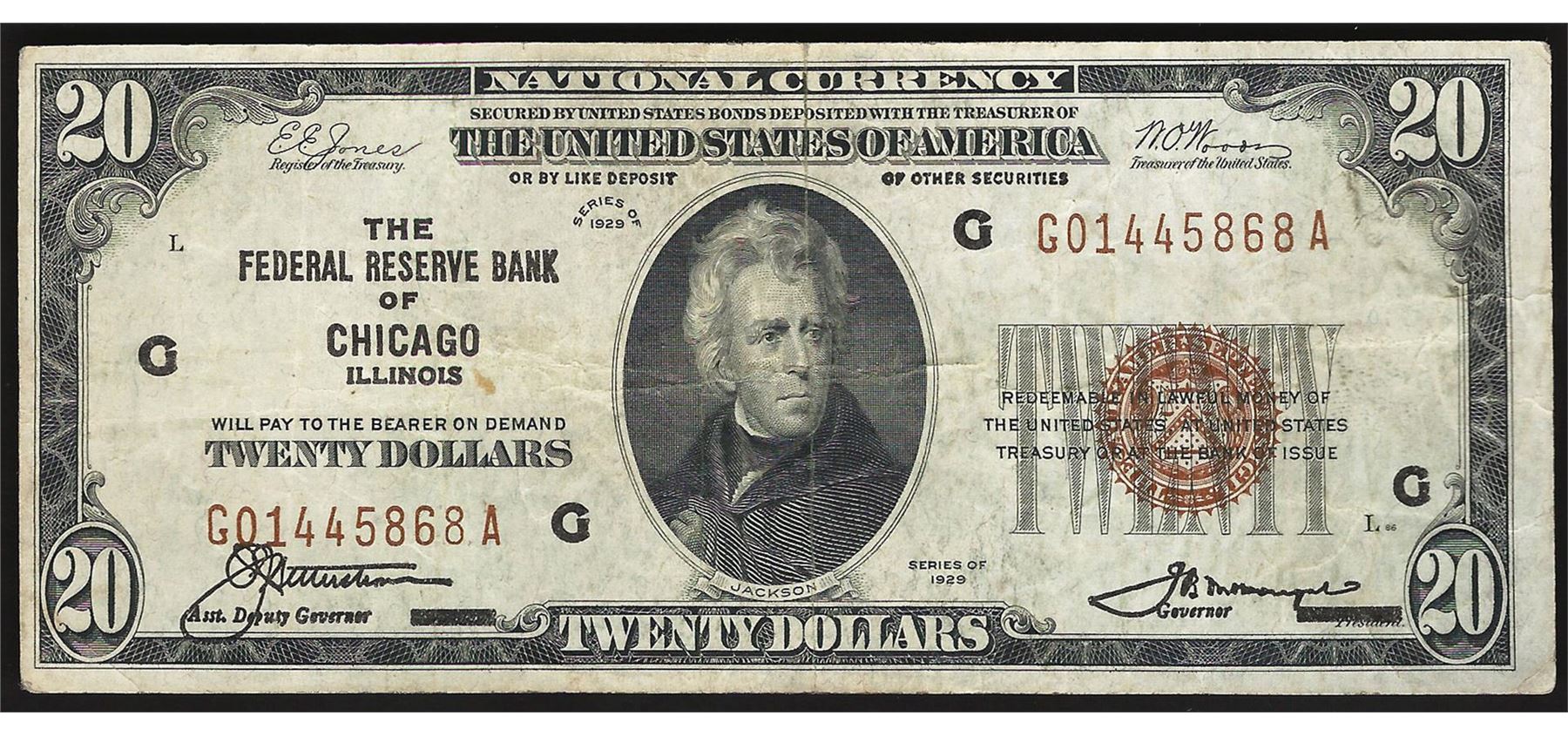 One 1929 $20 Federal Reserve Bank Note Chicago.