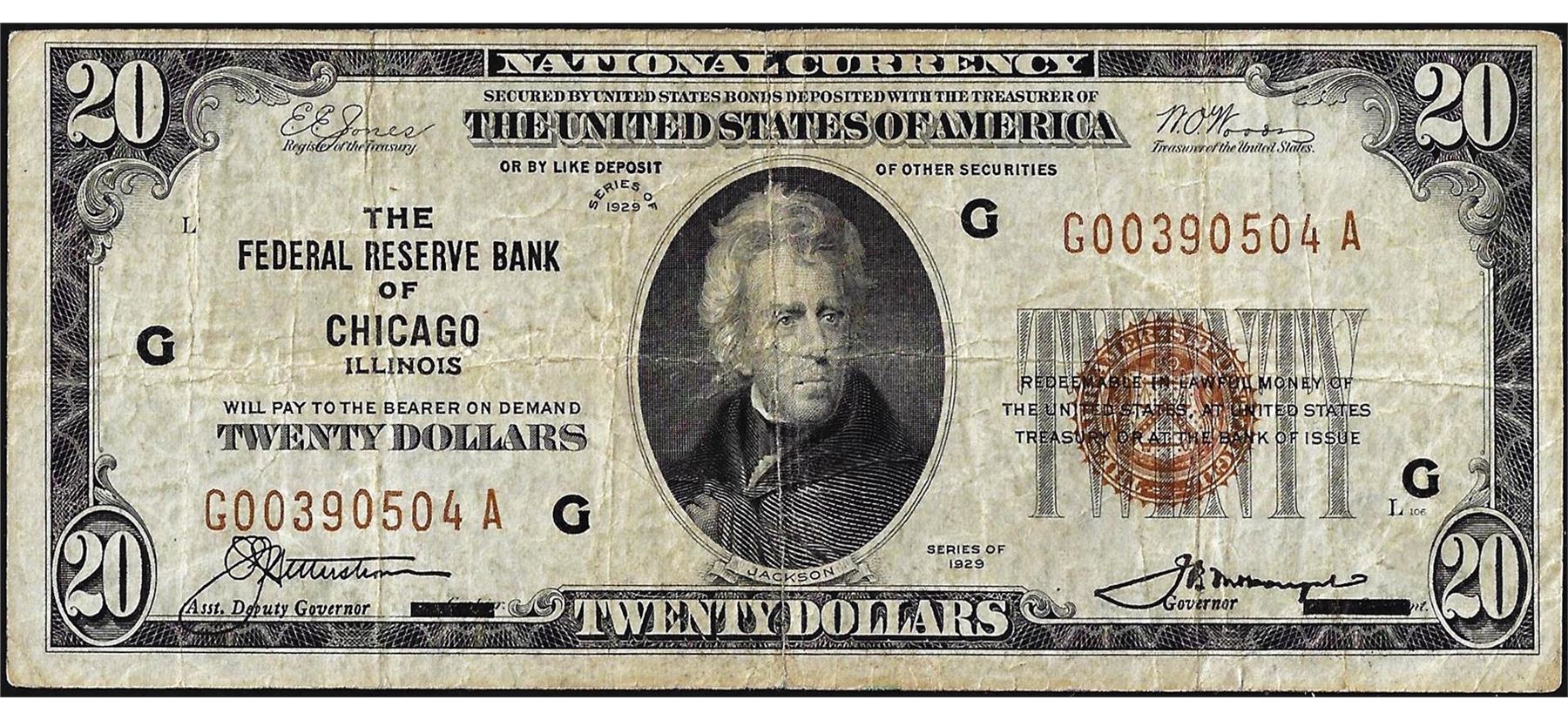 One 1929 $20 Federal Reserve Bank Note Chicago.