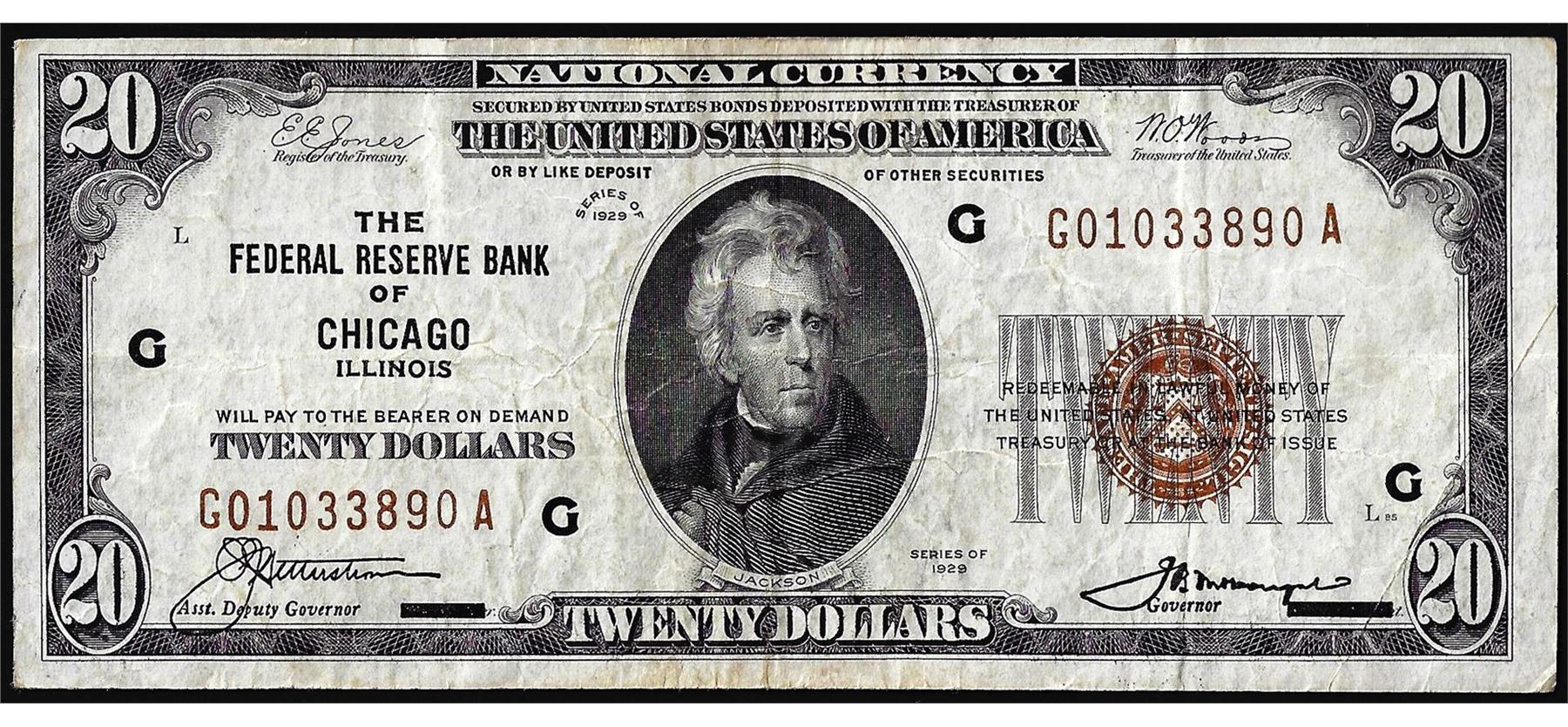 One 1929 $20 Federal Reserve Bank Note Chicago.