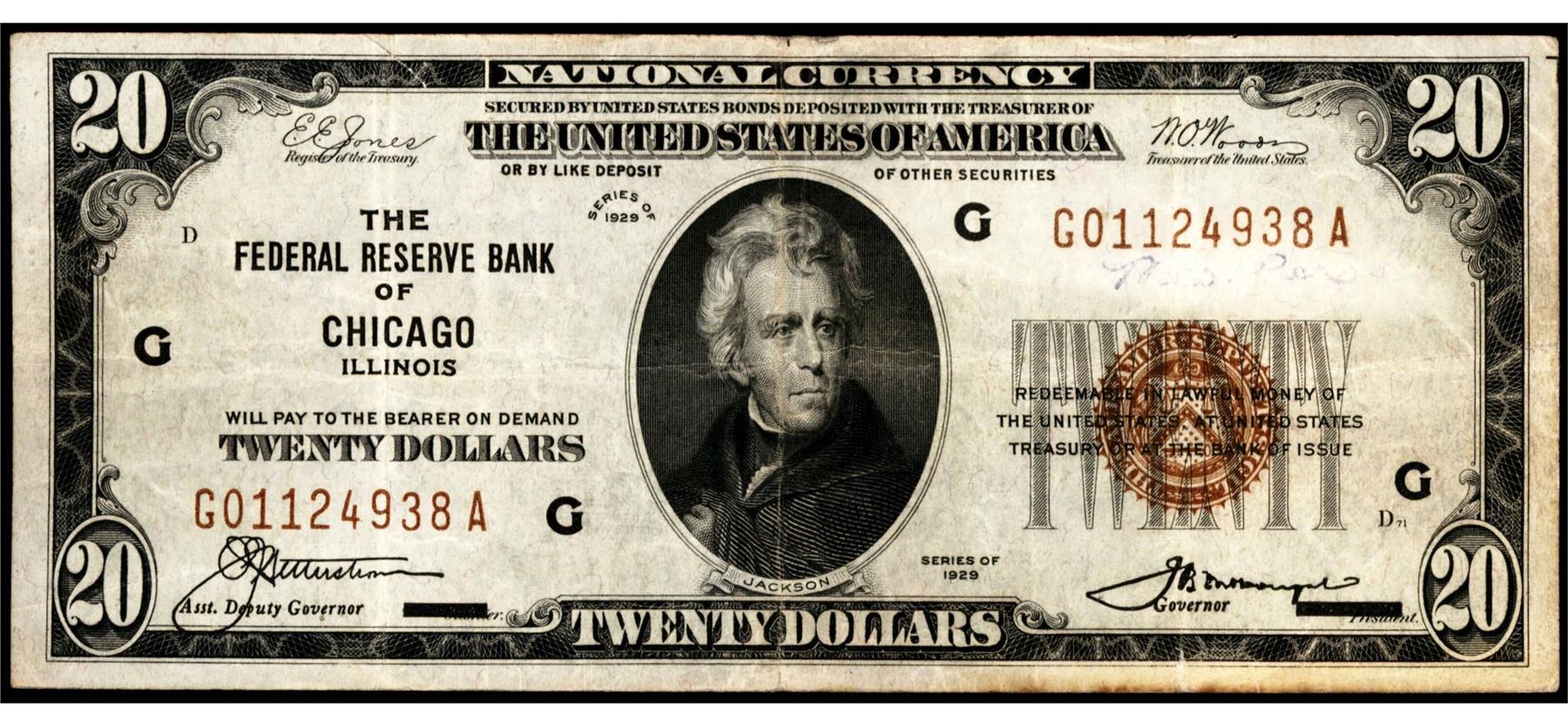 One 1929 $20 Federal Reserve Bank Note Chicago.