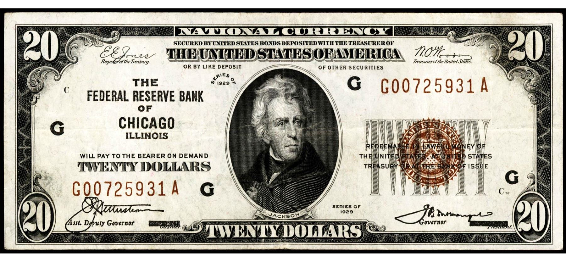 One 1929 $20 Federal Reserve Bank Note Chicago.