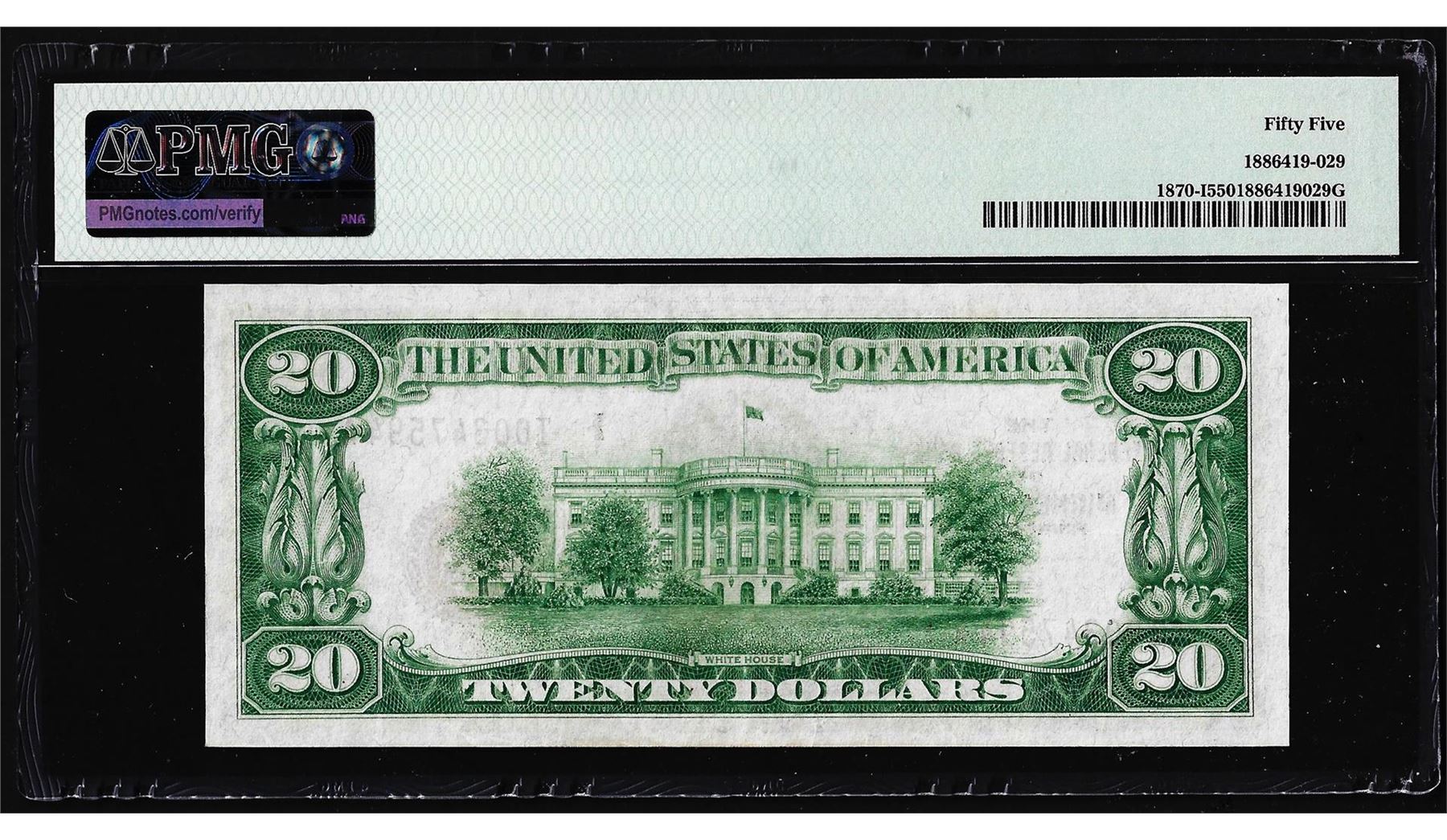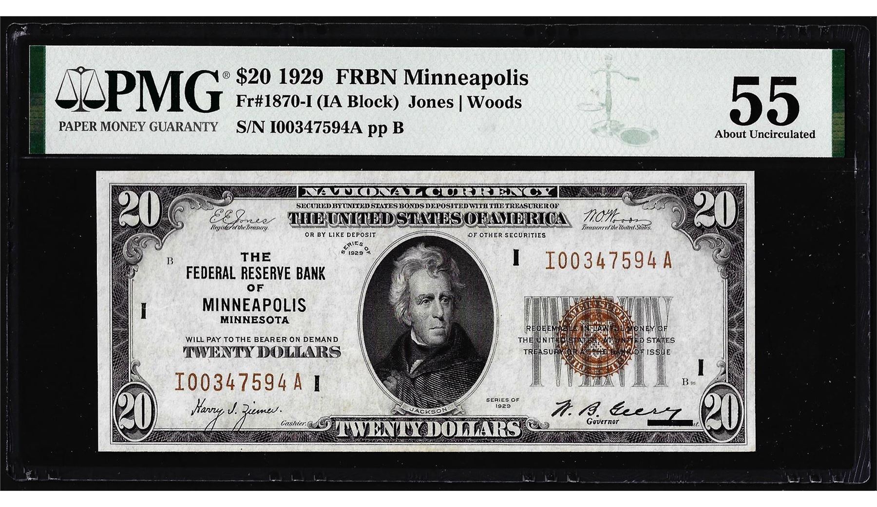 One 1929 $20 Federal Reserve Bank Note Minneapolis Fr.1870-I PMG About Uncirculated 55. PMG Certified.
