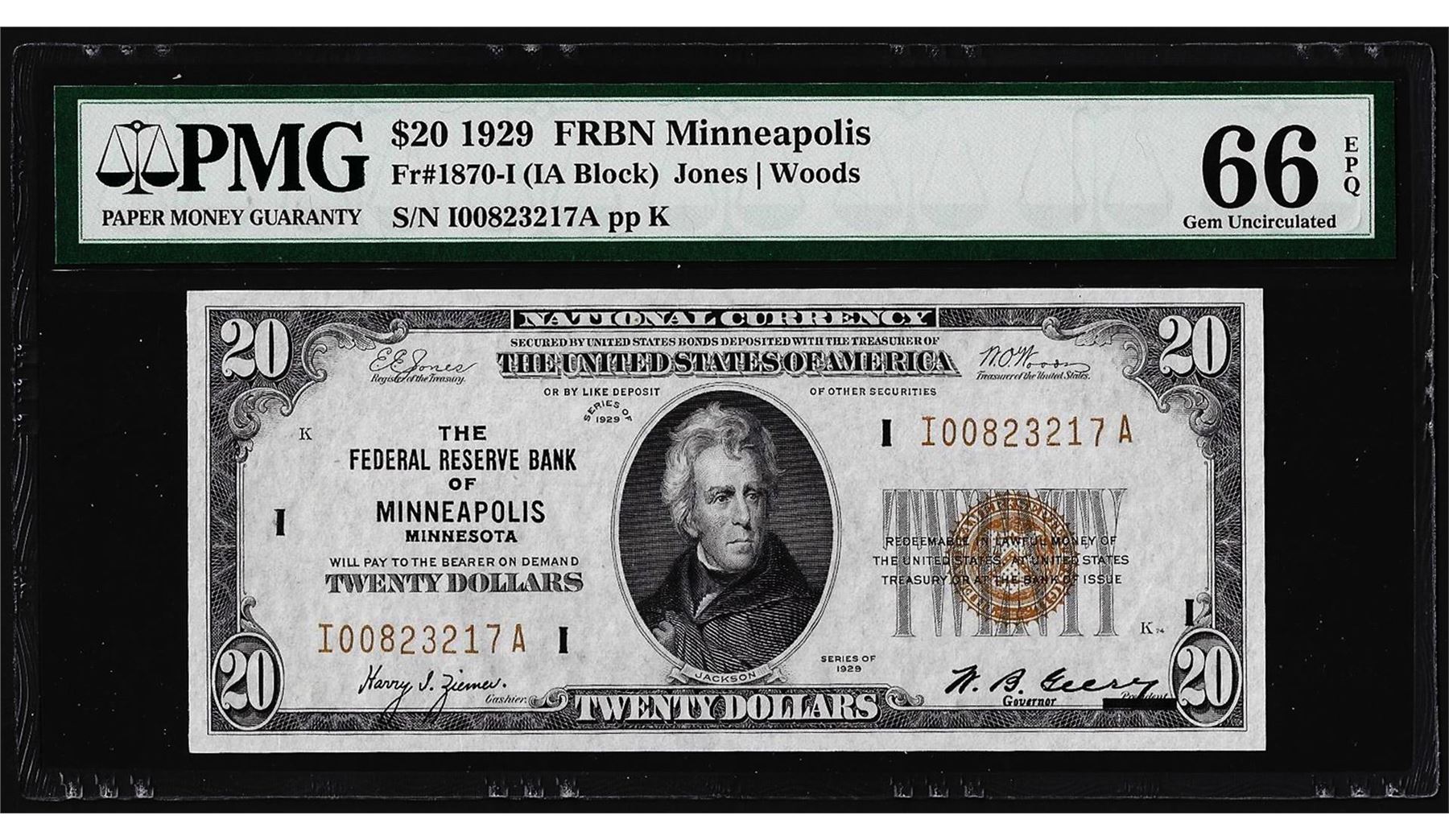 One 1929 $20 Federal Reserve Bank Note Minneapolis Fr.1870-I PMG Gem Uncirculated 66EPQ. PMG Certified.