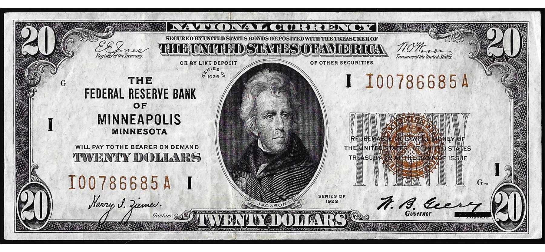 One 1929 $20 Federal Reserve Bank Note Minneapolis.