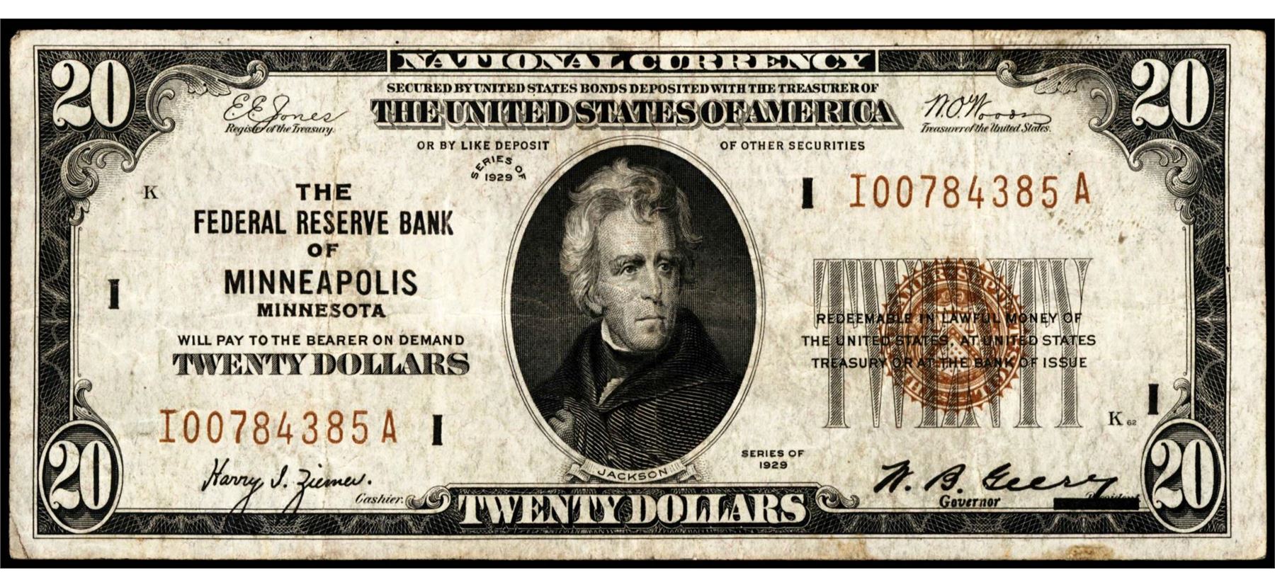 One 1929 $20 Federal Reserve Bank Note Minneapolis.