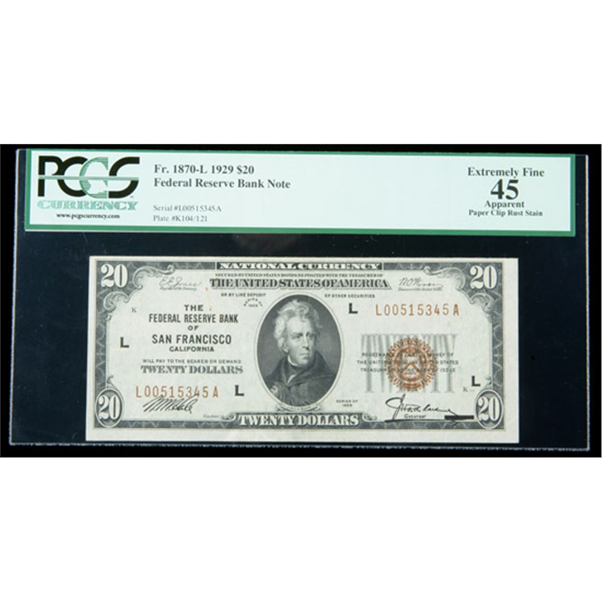 1929, $20 Federal Reserve Bank Note. PCGS Extremely Fine 45 Apparent. . Fr-1870-L. The back of this note has a single paperclip rust stain which is mentioned on the grading label. From the scarcer San Francisco district.
