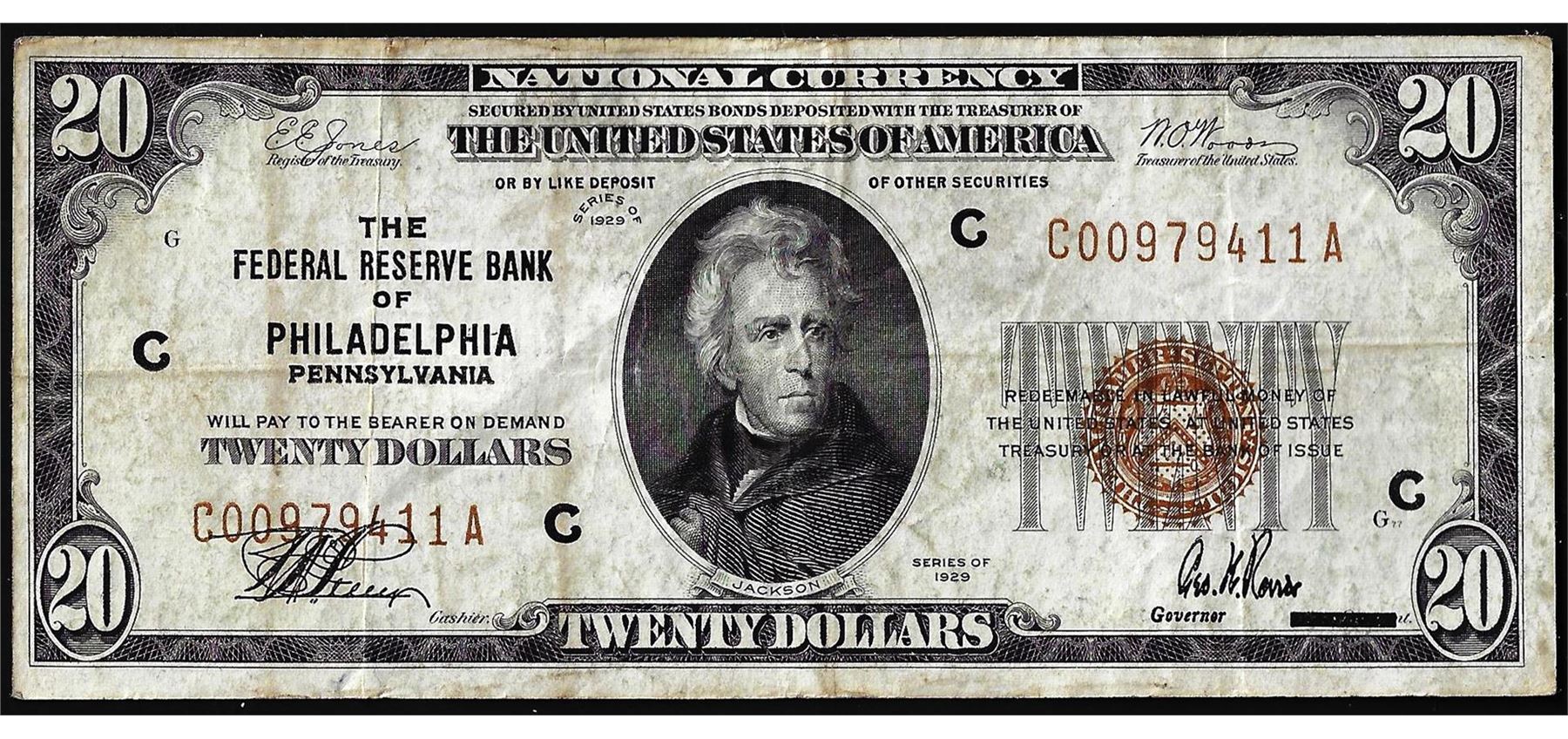 One 1929 $20 Federal Reserve Bank Note Philadelphia.