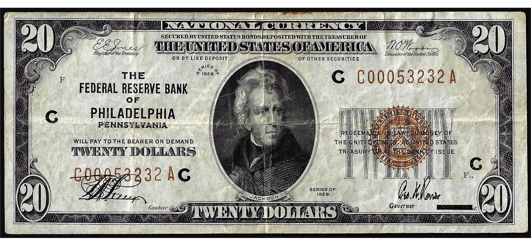 One 1929 $20 Federal Reserve Bank Note Philadelphia.