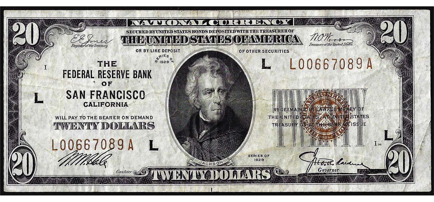 One 1929 $20 Federal Reserve Bank Note San Francisco.