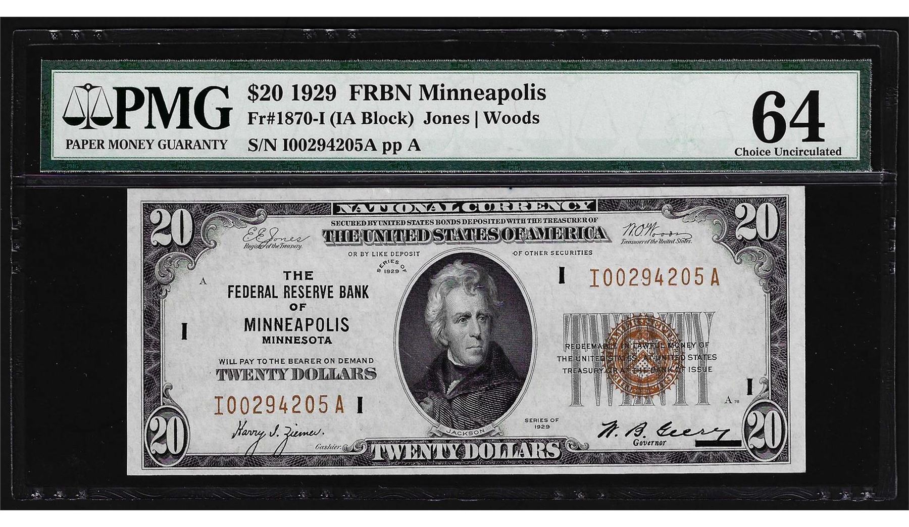 One 1929 $20 Federal Reserve Bank of Minneapolis Note PMG Choice Uncirculated 64. PMG Certified.