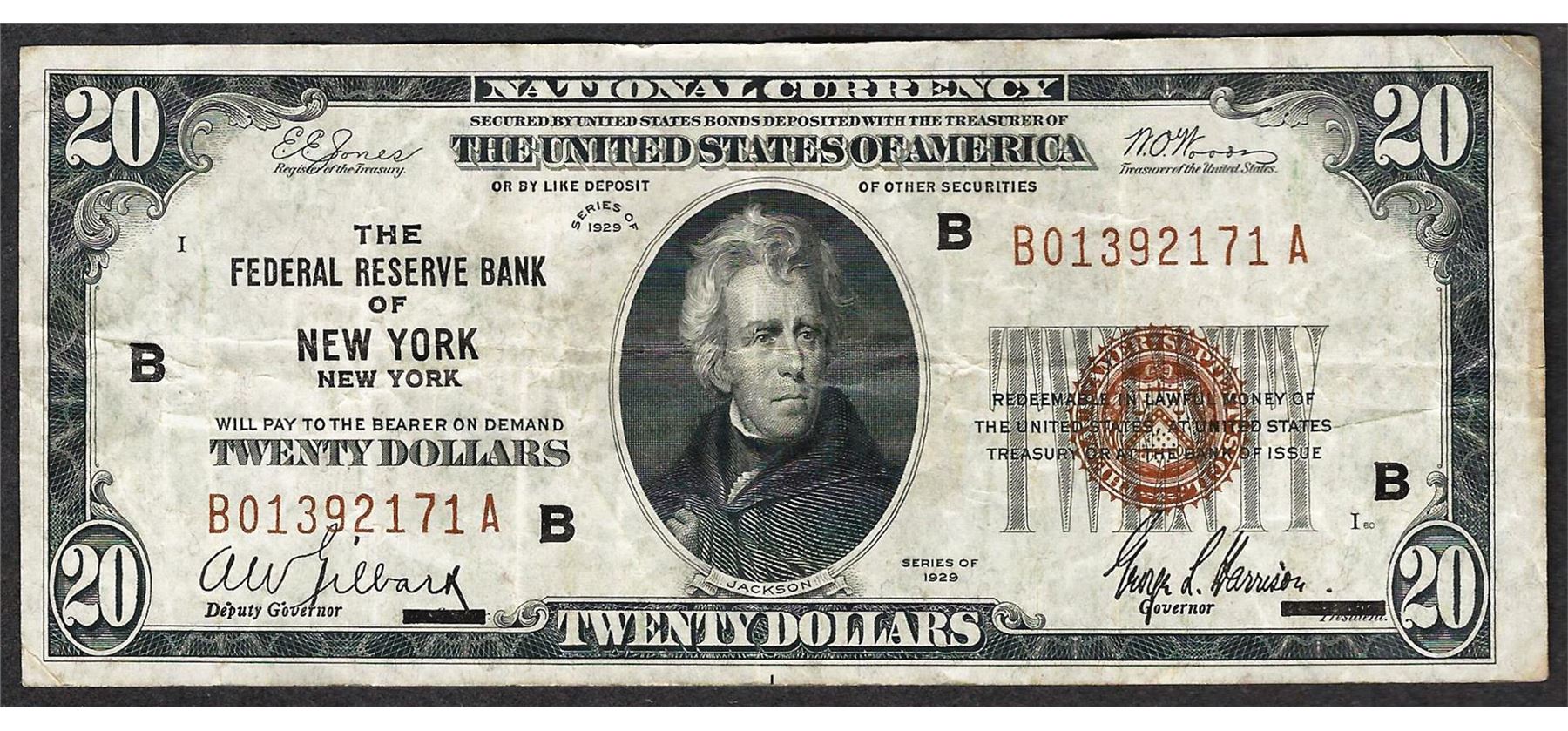 One 1929 $20 Federal Reserve Bank of New York New York Note.
