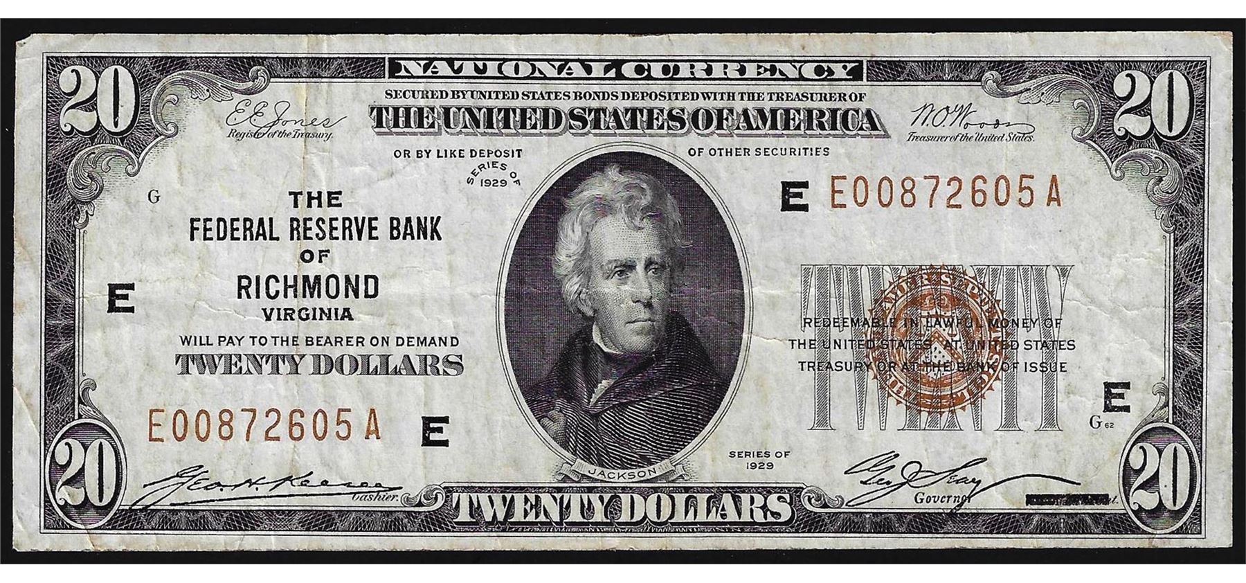 One 1929 $20 Federal Reserve Bank of Richmond, Virginia Note.