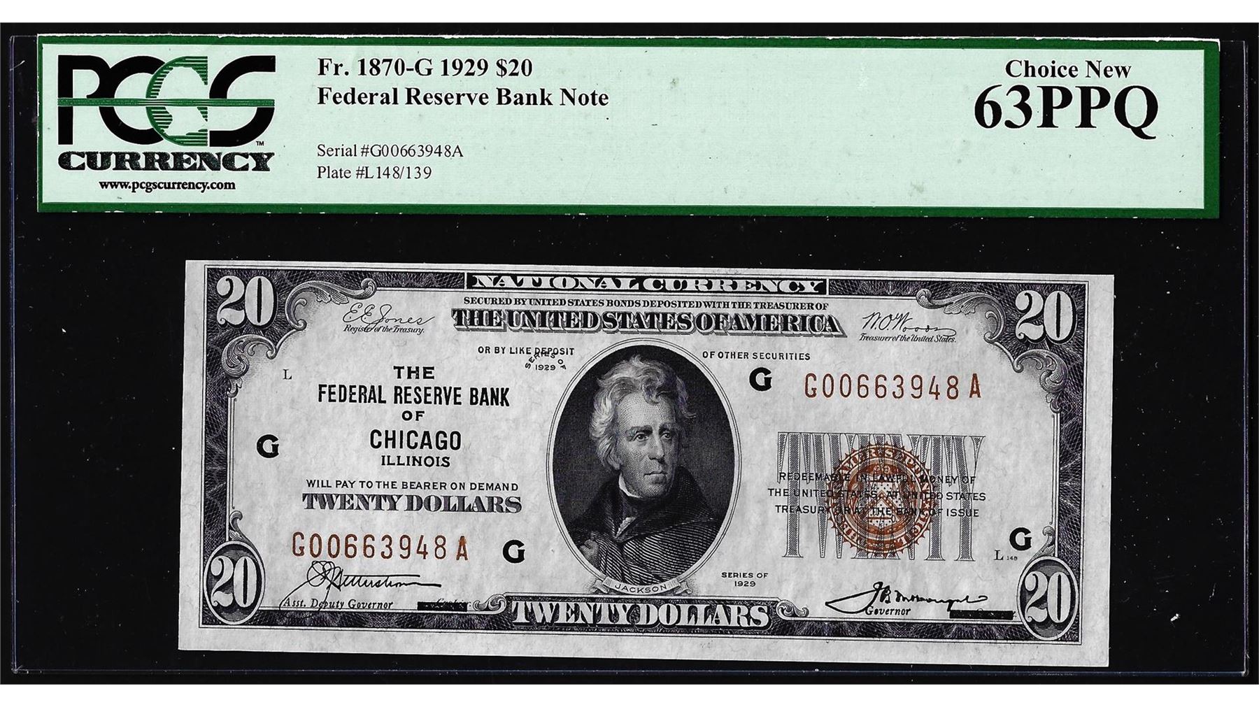 One 1929 $20 Federal Reserve Note Chicago Fr.1870-G PCGS Choice New 63PPQ. PCGS Graded.