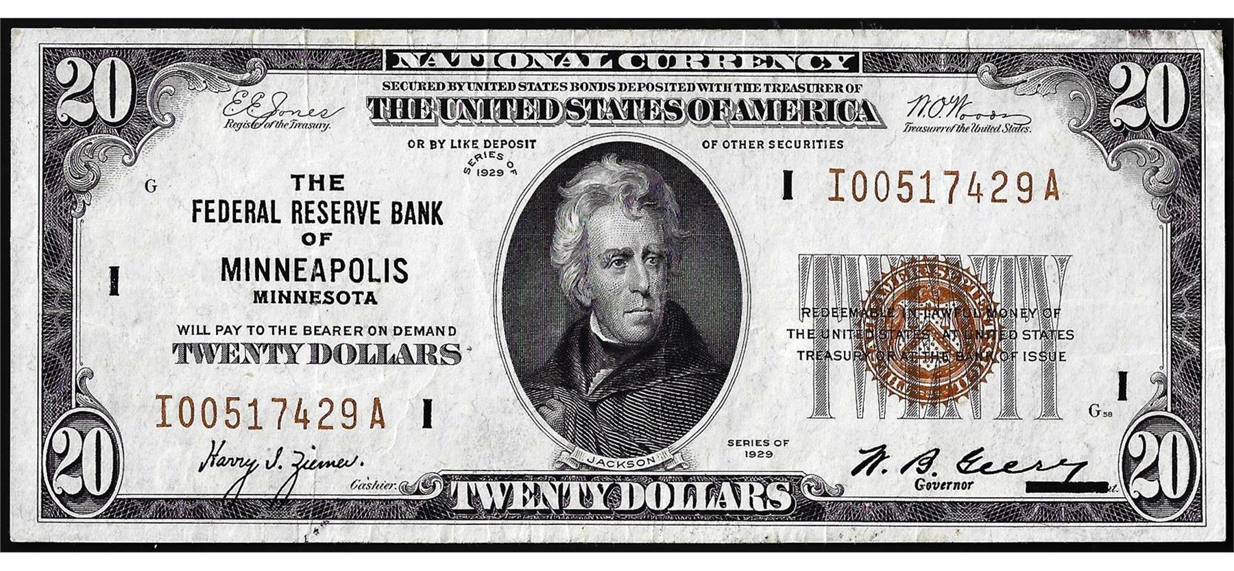 One 1929 $20 Federal Reserve Note Minneapolis.