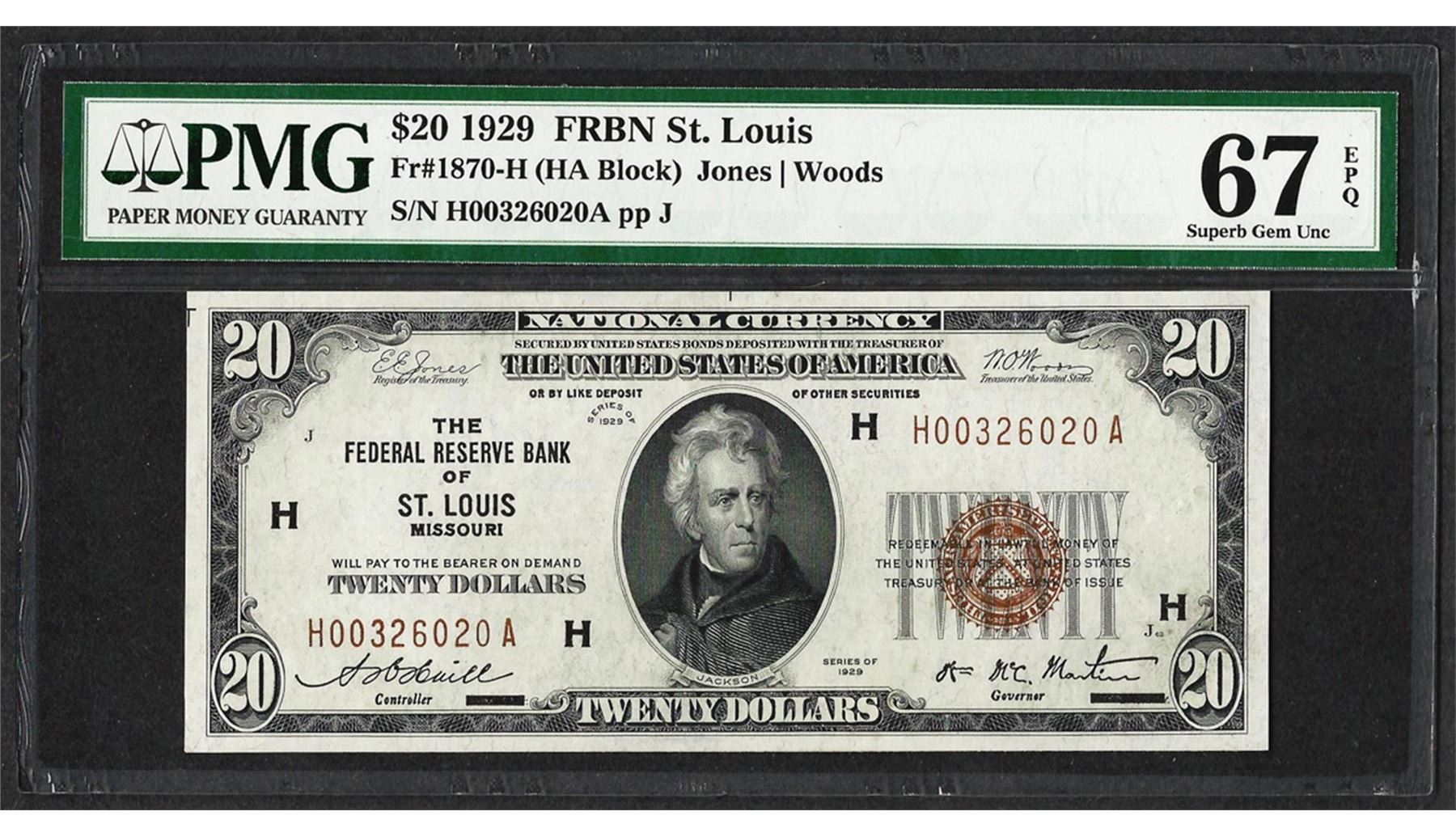 One 1929 $20 Federal Reserve Note St. Louis Fr.1870-H PMG Superb Gem Uncirculated 67EPQ. PMG Certified.
