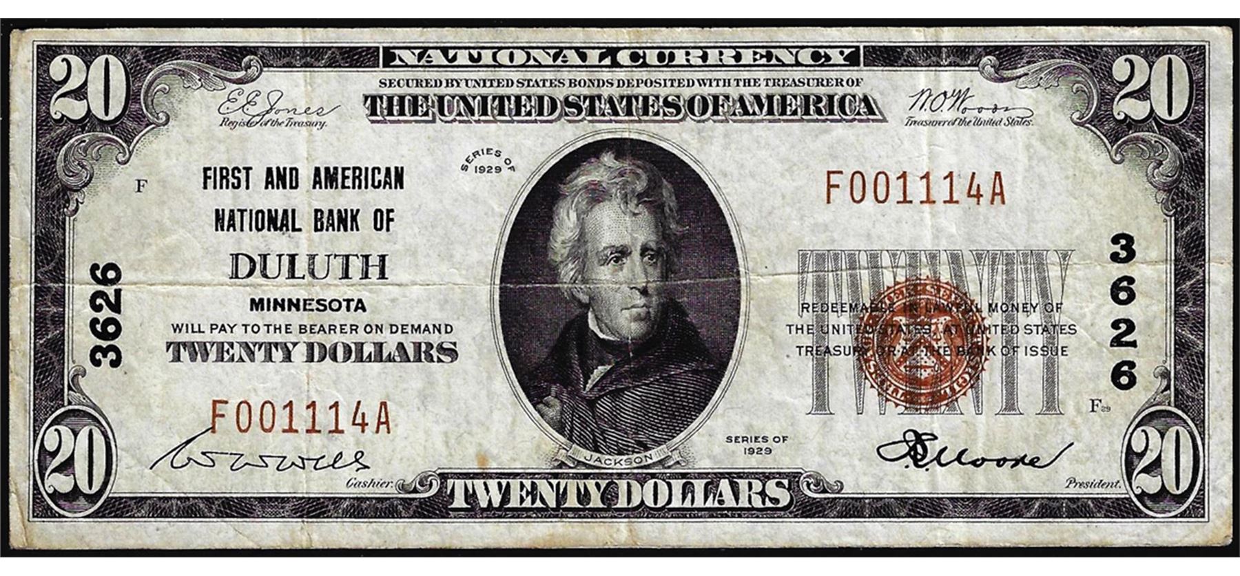 1929 $20 First American NB of Duluth, MN CH# 3626 National Currency Note