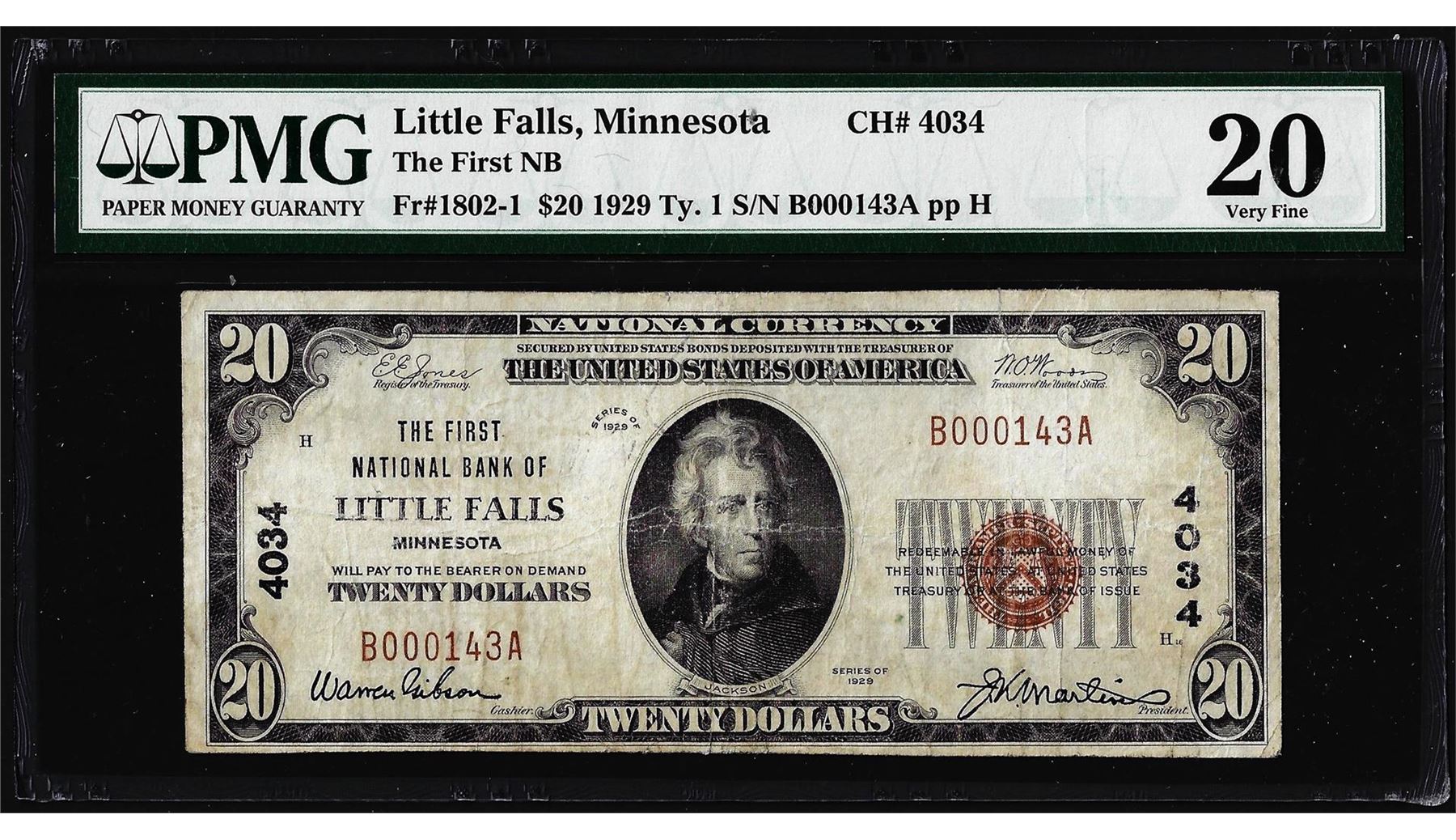 One 1929 $20 First NB Little Falls, MN CH# 4034 National Currency Note PMG Very Fine 20. PMG Certified.
