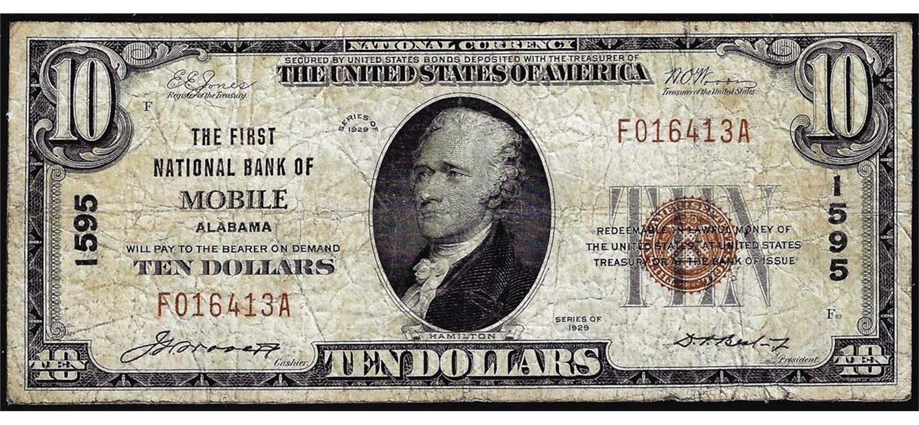 One 1929 $20 First NB Mobile, AL CH# 1595 National Currency Note.