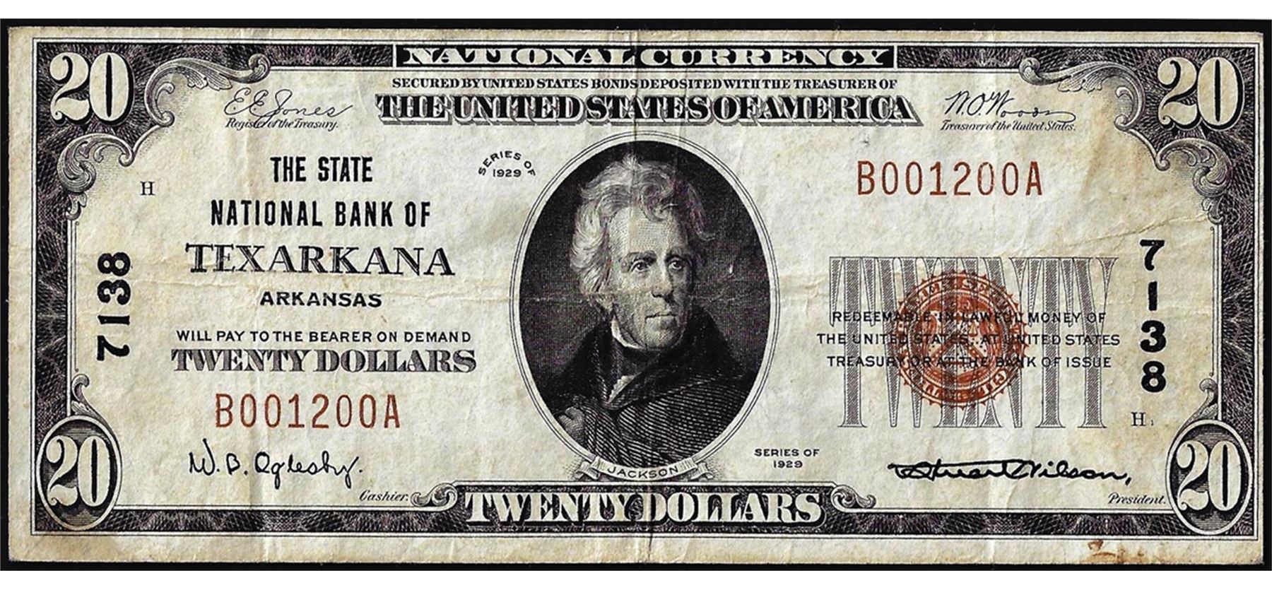 One 1929 $20 First NB of Texarkana, Arkansas CH# 7138 National Currency Note.