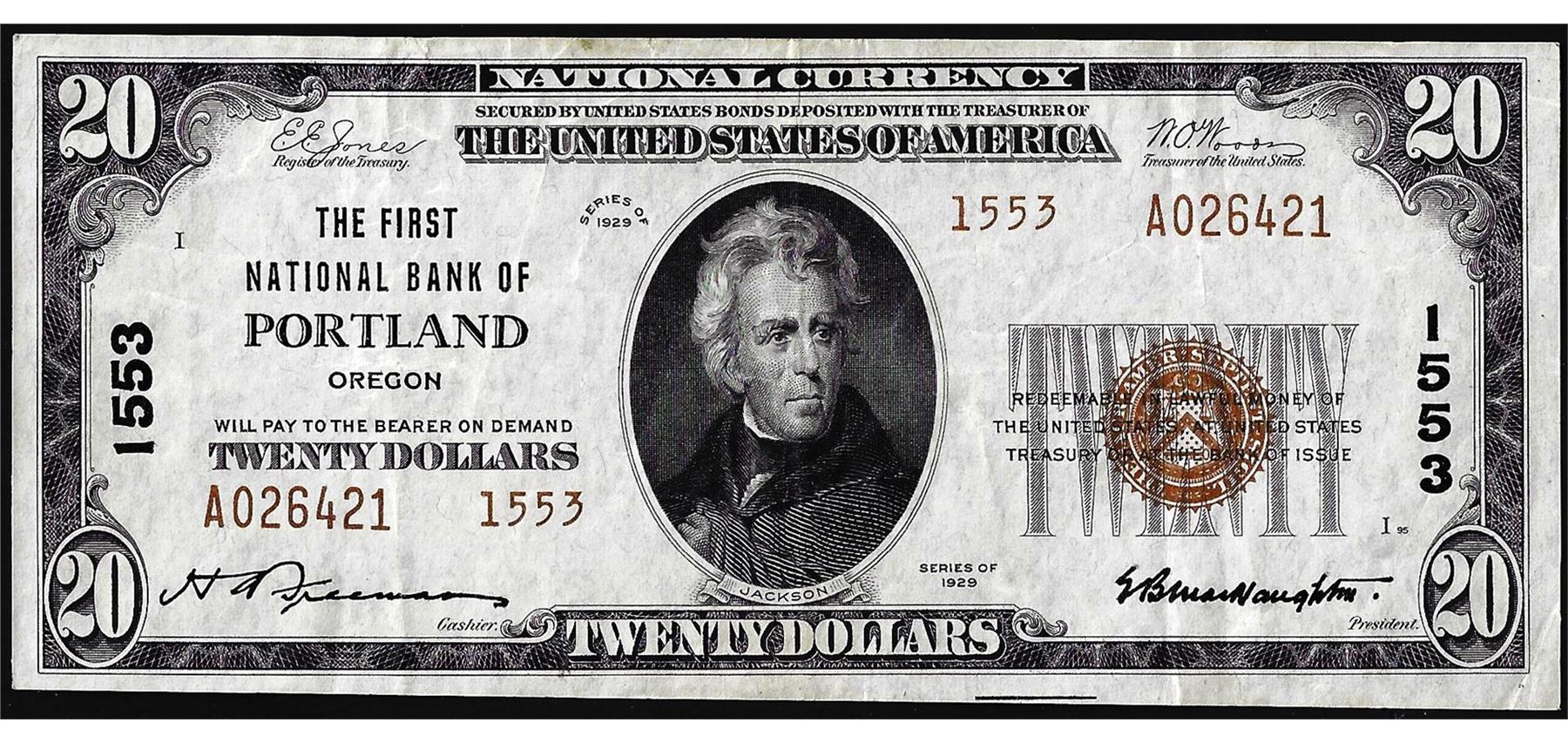 One 1929 $20 First National Bank of Portland, OR CH# 1553 National Currency Note.