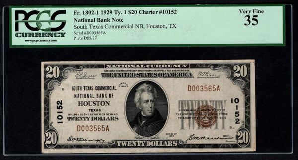 One 1929 $20 Houston National Bank Note PCGS 35.