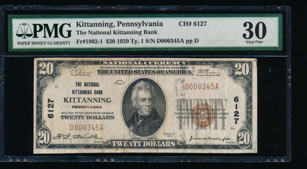 One 1929 $20 Kittanning National Note PMG 30.
