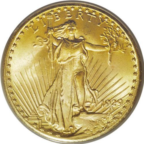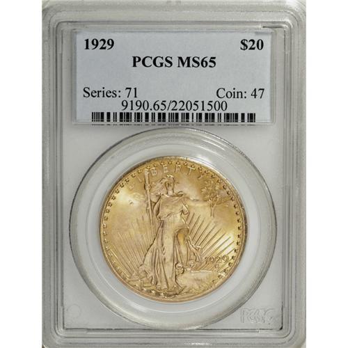 <B>1929 $20 MS65 PCGS.</B></I> After a series of common Philadelphia Mint issues from 1922 through 1928, the 1929 double eagle begins a final string of rare dates through the end of the series in 1933. These pieces are not rare due to limited mintage (1,779,750 struck in 1929), but rather due to limited distribution. Nearly every piece coined in 1929 and later years was stored in Mint or Treasury vaults until they could be melted after the 1933 gold elimination act.<BR> Two small hoards account for many of the pieces that are on the market today. A group of 40 pieces was discovered in the 1980s in England, while a smaller accumulation of 10 pieces appeared in the early 1990s. For this date, either one of these can be considered a significant event. It is not known how many examples of this date still survive, although estimates range from a low of 60 pieces a figure the Breen called reasonable to a high of nearly 1,800 pieces per Bowers. This latter figure seems substantially high. Perhaps the actual number of coins that survive today is in the range of 200 pieces.<BR> This gorgeous Gem, which approaches finest certified honors, is sharply defined with highly lustrous and frosty yellow-gold surfaces. Splashes of honey-gold color on each side add to its eye appeal. There are no abrasions that represent any concern on either side of this Gem Population: 20 in 65, 5 finer (12/06).<BR><I>From The Matt & Susan Brown Family Collection of Saint-Gaudens Double Eagles.</B></I><BR><BR><b>Shipping:</b> Coin/Currency (<a target="_blank" href="http://www.heritageauctions.com/common/shipping.php">view shipping information</a>)