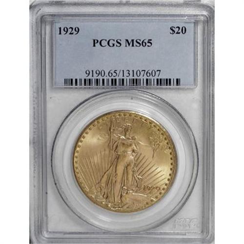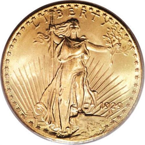 <B>1929 $20 MS65 PCGS.</B></I> Beginning with this date, all issues in the Saint-Gaudens double eagle series are notable rarities. Of the five collectible issues (1929, 1930-S, 1931, 1931-D, and 1932), the 1929 is the most obtainable with respect to overall availability. David Bowers (2004), writing about the 1929 in his 2004 treatise entitled <I>A Guide Book of Double Eagle Gold Coins</B></I>, elaborates on this date's availability: <BR><BR>“A very scarce issue that a few years ago was considered to be a major rarity. However, many hundreds of coins now have sneaked into the market, without fanfare … . For the first time in modern numismatic history the 1929 is readily available and somewhat affordable (but hardly inexpensive). Now, many collections will end with the 1929 date instead of 1928 as formerly.”<BR><BR> As reported by Jeff Garrett and Ron Guth in their 2006 book <I>Encyclopedia of U.S. Gold Coins, 1795-1933</B></I>: “A small hoard of 40 coins was discovered in 1984 in England, and author Jeff Garrett purchased a small group of 10 coins in the early 1990s.” We are not aware of any other sizable holdings of this issue that have been uncovered recently.<BR> PCGS and NGC have, to date, certified approximately 280 1929 double eagles, ranging in grades from AU55 to MS66. The vast majority of these are MS62 to MS64. The two services have seen 26 MS65 pieces, and six Premium Gems. Some of these specimens are likely resubmissions.<BR> The Gem coin in this lot is highly lustrous and possesses frosty peach-gold surfaces. A well-executed strike translates to sharp definition on the design features, including Liberty’s head and the fingers on both hands, the panes in the Capitol building, and the eagle’s plumage. A few minute marks are visible, but are well within the parameters of the MS65 grade classification. Copper alloy spots, often seen on this issue, are not present on this coin. This is an excellent opportunity for the Saint-Gaudens enthusiast to acquire one of the rarer dates in the series.<BR><BR><B>Coin Engraver:</B> Augustus Saint-Gaudens<BR><BR><b>Shipping:</b> Coins & Currency (<a target="_blank" href="http://www.heritageauctions.com/common/shipping.php">view shipping information</a>\)