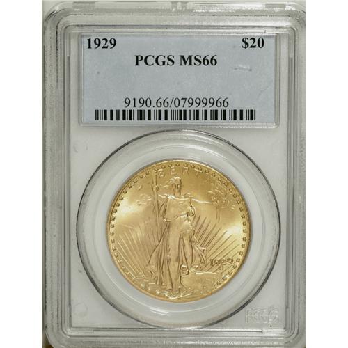 <B>1929 $20 MS66 PCGS.</B></I> Various experts have different opinions regarding the number of 1929 double eagles that still exist. While the original mintage was 1,779,750 coins, most remained in the hands of the Treasury and were melted after gold was recalled in 1933. Jeff Garrett and Ron Guth wrote: "The last readily obtainable Saint-Gaudens double eagle is the 1928 issue. Beginning with the 1929 double eagle and continuing through the 1933 issue, any collector who undertakes obtaining these issues does so with extreme care and financial fortitude. As seen on earlier mintmarked issues, the 1929 double eagle was summarily rounded up and melted down in the 1930s. Few examples of this issue had left the country at this time, as the world economies sunk into a deepening depression, which started in mid-1929 with contracting trade and was loudly announced by the American stock market crash on October 29, 1929." Actual opinions of the experts regarding the number of known pieces ranges from 60 to 1,750. Only 293 pieces have been certified by NGC and PCGS (11/06), suggesting that the estimate that 1,750 coins still exist is exceptionally high.<BR> What is not open to debate is the number of coins that survive in Gem or finer grades. For example, PCGS has certified just 20 pieces in MS65 and five more in MS66, for a total of 25 coins. At the same time, NGC has graded exactly four Gem MS65 grade coins and only one MS66 piece.<BR> As we wrote in our Phillip Morse catalog: "The astute collector, with patience and the concomitant finances, should be able to acquire a better Mint State 1929. Furthermore, such a coin is likely to exude considerable eye appeal. According to Akers (1988) and Bowers, the typical 1929 is nearly always very sharply struck, is fully frosty, and very lustrous. Most specimens are a medium to rich greenish-gold or yellow-gold color, sometimes with faint rose or orange overtones." This Premium Gem seems to match the description from our Morse catalog in terms of individual appearance with extremely sharp design elements, highly lustrous and fully brilliant frosty surfaces, and exceptional yellow-gold color. It is also finer than either of the Morse coins, which graded MS65 and MS64.<BR><BR><b>Shipping:</b> Coin/Currency (<a target="_blank" href="http://www.heritageauctions.com/common/shipping.php">view shipping information</a>)