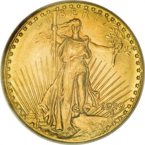 <B>1929 $20 MS66 PCGS.</B></I> Like so many other issues in this fabled and fabulous series, the 1929 Saint-Gaudens was once considered a major rarity, only to see its position somewhat eroded over time as the repatriations of overseas caches of coins occur. Today it is still a scarcity and expensive, but examples are available for a price, as nearly 300 examples are certified between NGC and PCGS. Most of those coins, in fact the vast majority, are MS64 or less, although the MS64 grade represents the bulk of the certified coinage for the issue. Between NGC and PCGS, 149 pieces fall into that near-Gem grade level. At the Gem or MS65 level the number certified plummets sharply, and in MS66 the total drops even more radically. There are 27 Gem pieces certified, and only six coins at both services combined have achieved the Premium Gem or MS66 level, including the present piece. All of the above totals, of course, almost certainly include unknown but considerable numbers of resubmissions.<BR> Bowers' <I>Guide Book of Double Eagle Gold Coins </B></I>aptly calls the 1929 issue a "changing rarity in modern times," although we disagree with his lumping it with the common 1922-1928 Saint-Gaudens pieces when he says, "Now, many collections will end with the 1929 date instead of 1928 as formerly." <I>Au contraire,</B></I> we believe the 1929 date will always remain associated with the various legendary issues including the 1930-S, 1931, 1931-D, and 1932. While the latter pieces are notably rarer than the 1929, the association is apt for two reasons: First, because all of the group were issued during the Great Depression, and second, the 1929 is orders of magnitude rarer than the earlier Philadelphia Mint dates from 1922 to 1928.<BR> Bowers' estimate of 1,250 to 1,750 pieces extant also appears wildly optimistic, given the certified totals and the distant probability of many more examples remaining undiscovered. In <I>The Coinage of Augustus Saint-Gaudens as Illustrated by the Phillip H. Morse Collection, </B></I>the authors note, "It seems highly unlikely that any sizeable quantity of an expensive coin such as the 1929 Saint could exist without being certified. Around 40 pieces were discovered in England in 1984, but we are not aware of any other sizeable holdings of this issue that have been uncovered recently."<BR> It is extremely telling and significant that the present MS66 specimen is even finer than either of the Morse Collection pieces, an MS65 that brought $97,750 and an MS64 that yielded $35,938 in the 2005 FUN Auction (Heritage, 11/2005, lots 6707-6708). In point of fact, this is one of only five MS66 pieces certified at PCGS, with a single MS66 at NGC, and there are none finer at either service (12/07).<BR> Exuberant cartwheel luster, more frosty than satiny, radiates from each side of this delectable coin. The centers are a lovely apricot-gold, while the peripheries on each side show tinges of mint-green. There are no singular abrasions on either side, and the strike is pleasingly bold. The latter characteristic is typical of the 1929 issue, which generally comes well struck. This piece represents another significant prize in this wonderful run of high-grade double eagles, an opportunity unlikely soon to repeat.<BR><I>From The Jacob Collection of Saint-Gaudens Double Eagles.</B></I><BR><BR><B>Coin Engraver:</B> Augustus Saint-Gaudens<BR><BR><b>Shipping:</b> Coins & Currency (<a target="_blank" href="http://www.heritageauctions.com/common/shipping.php">view shipping information</a>)