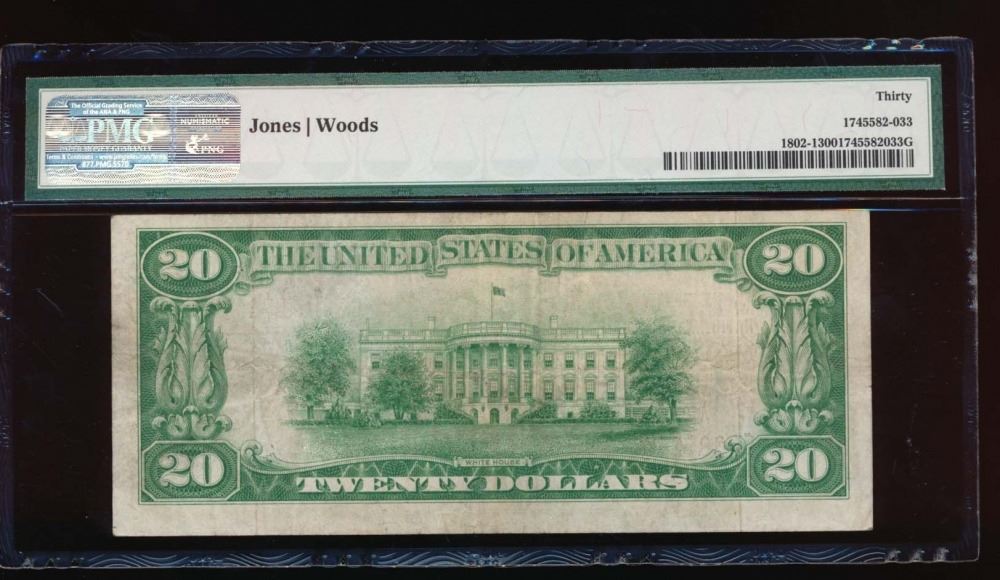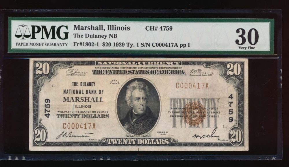 One 1929 $20 Marshall National Bank Note PMG 30.