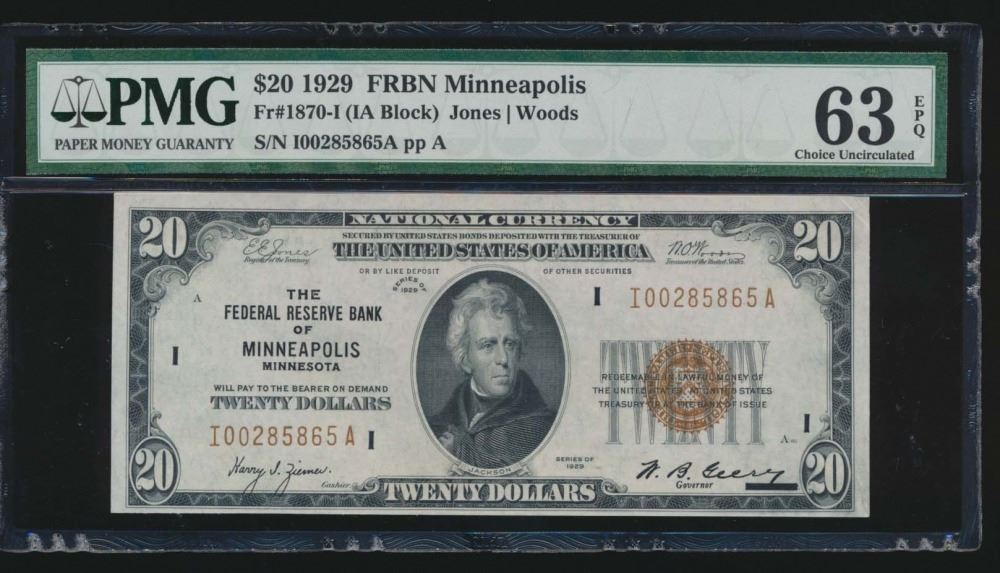 One 1929 $20 Minneapolis Federal Reserve Bank Note PMG 63EPQ.