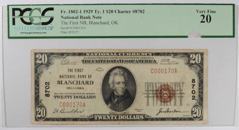 1929 $20 NATIONAL BLANCHARD, OK #8702 PCGS 20