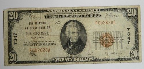 1929 $20 NATIONAL LACROSSE, WI #7347 VG