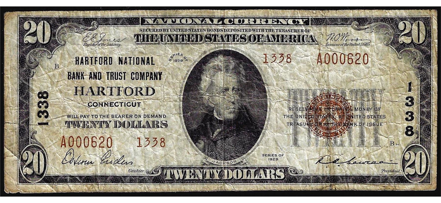 One 1929 $20 NB & Trust Hartford, CT CH# 1338 National Currency Note.