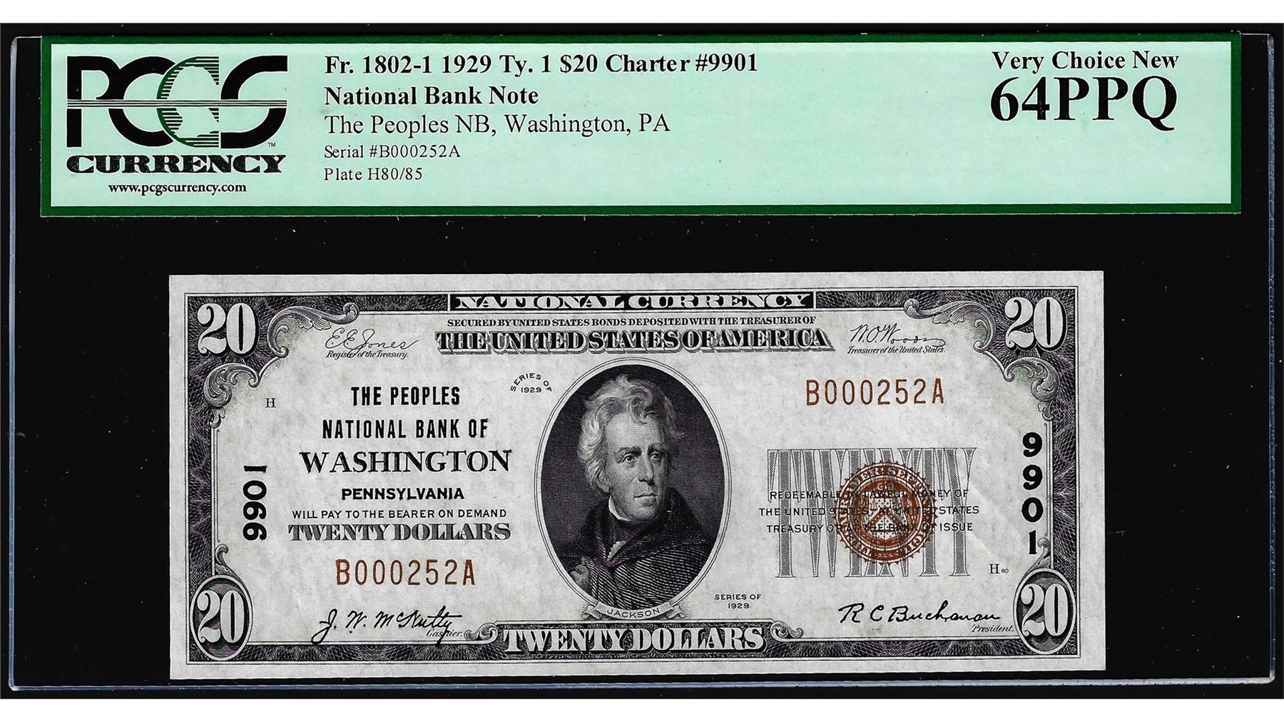One 1929 $20 NB Washington, PA CH# 9901 National Currency Note PCGS Very Choice New 64PPQ. PCGS Graded.
