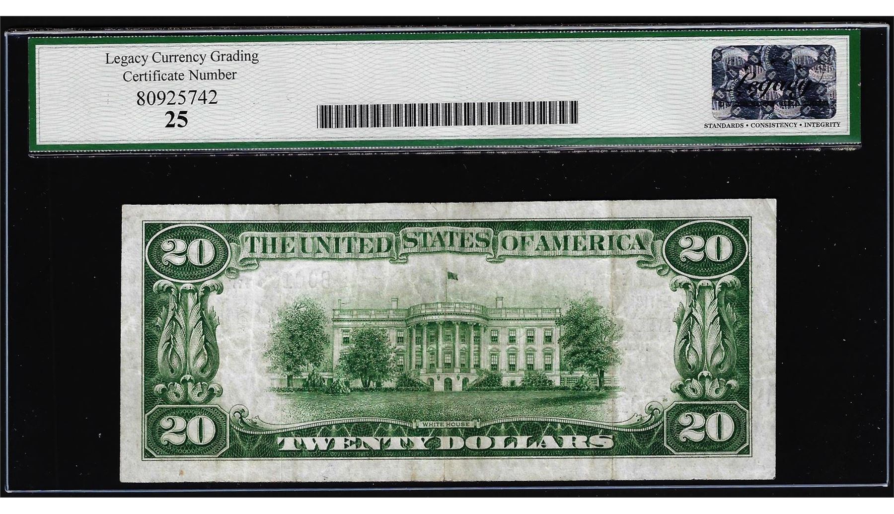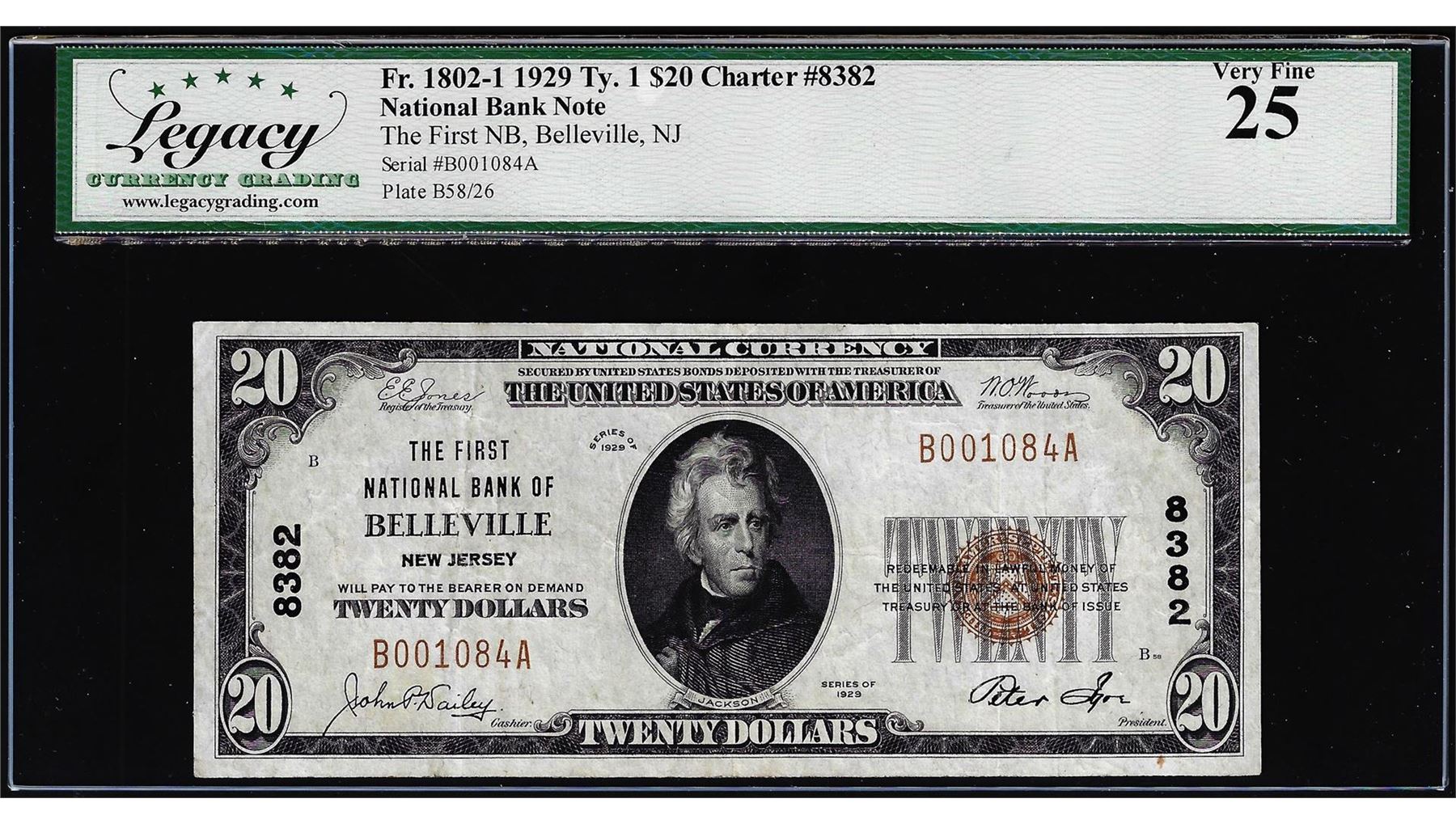 One 1929 $20 NB of Belleville, NJ CH# 8382 National Currency Note Legacy Very Fine 25. Legacy Graded.