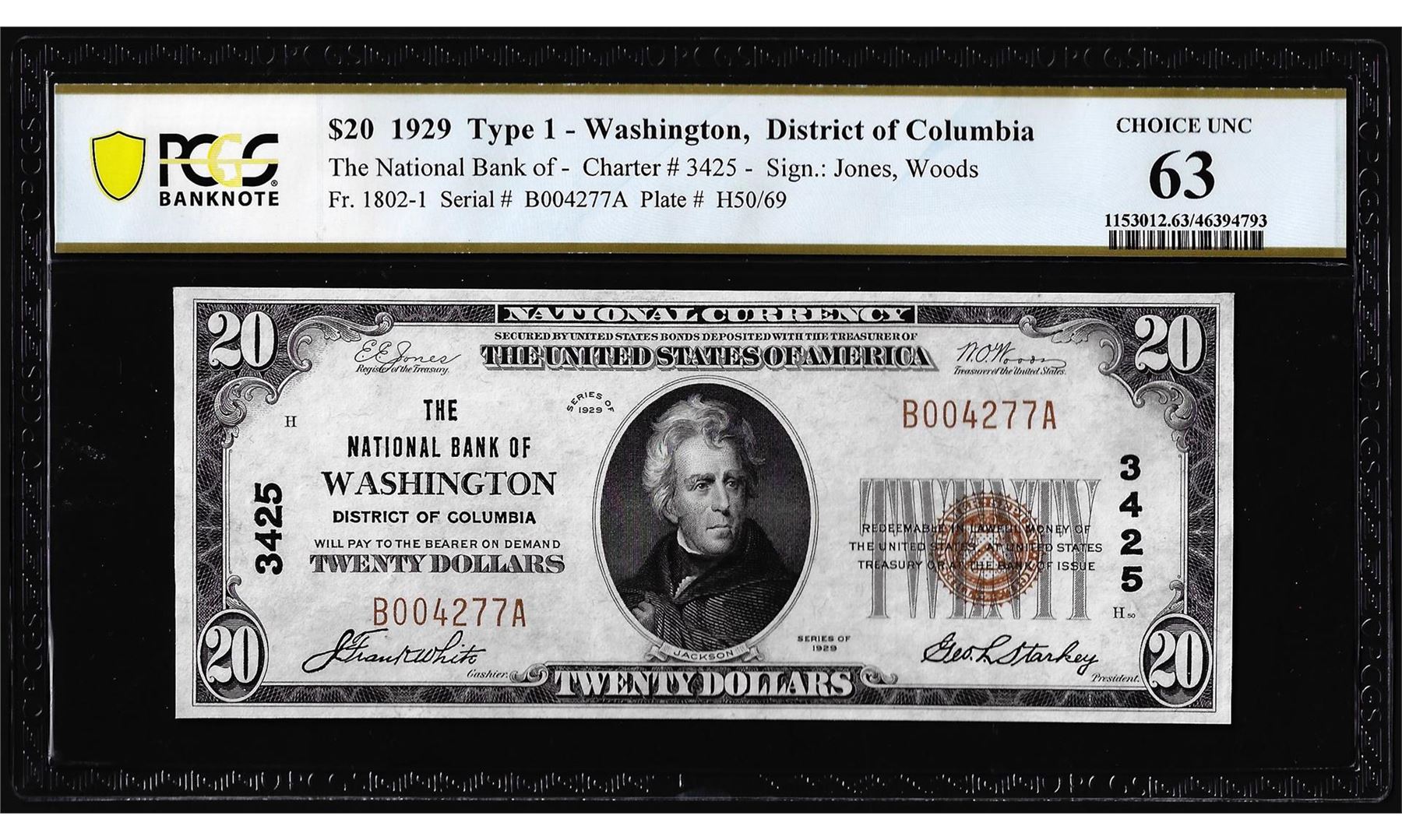 One 1929 $20 NB of Washington, D.C. Ch# 3425 National Note PCGS Choice Uncirculated 63. PCGS Graded.