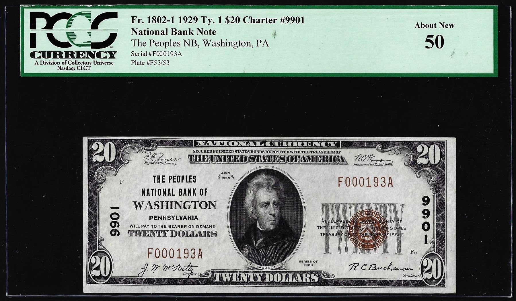 One 1929 $20 NB of Washington, PA CH# 9901 National Currency Note PCGS About New 50.
