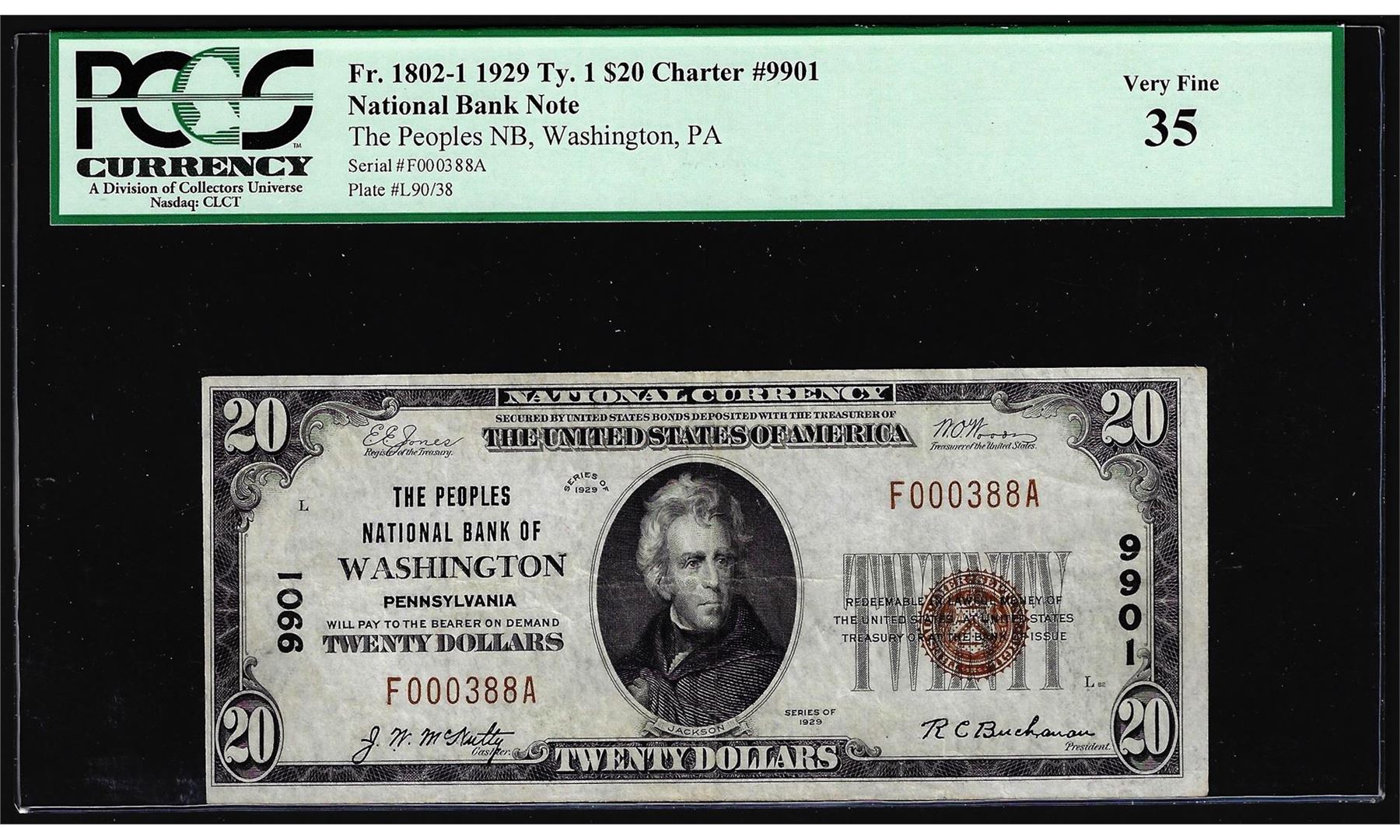 One 1929 $20 NB of Washington, PA CH# 9901 National Currency Note PCGS Very Fine 35. PCGS Graded.