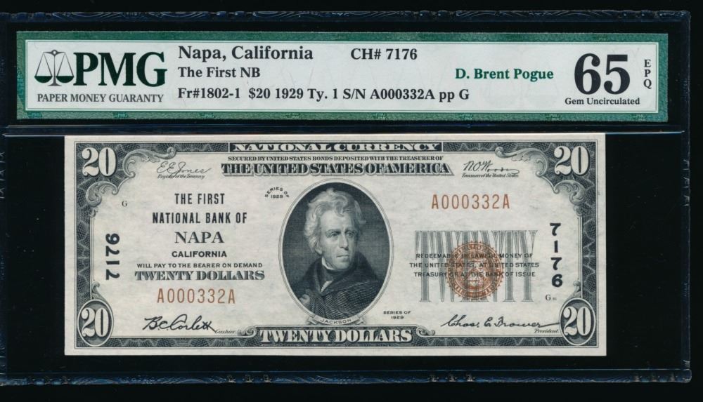 One 1929 $20 Napa National Bank Note PMG 65EPQ.