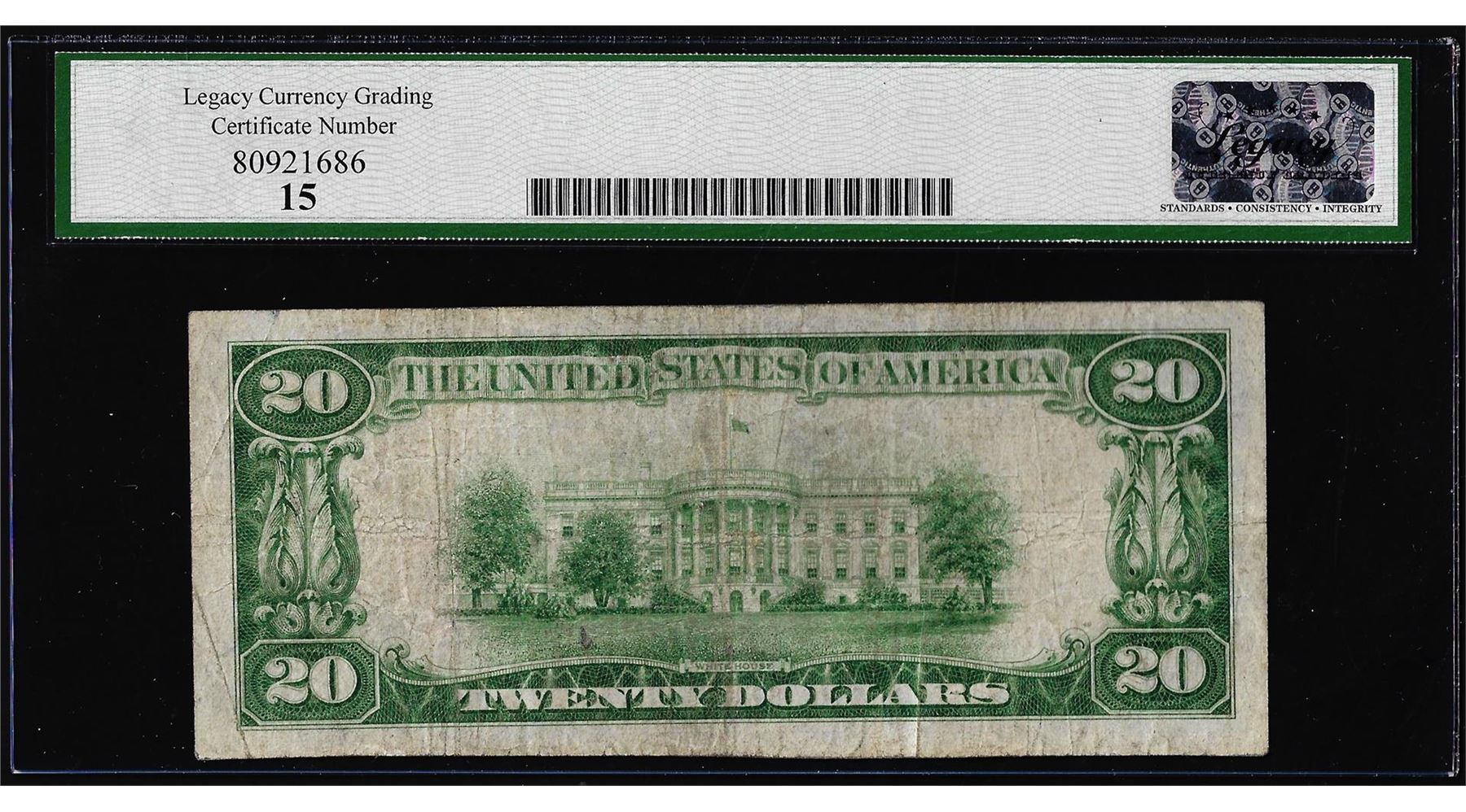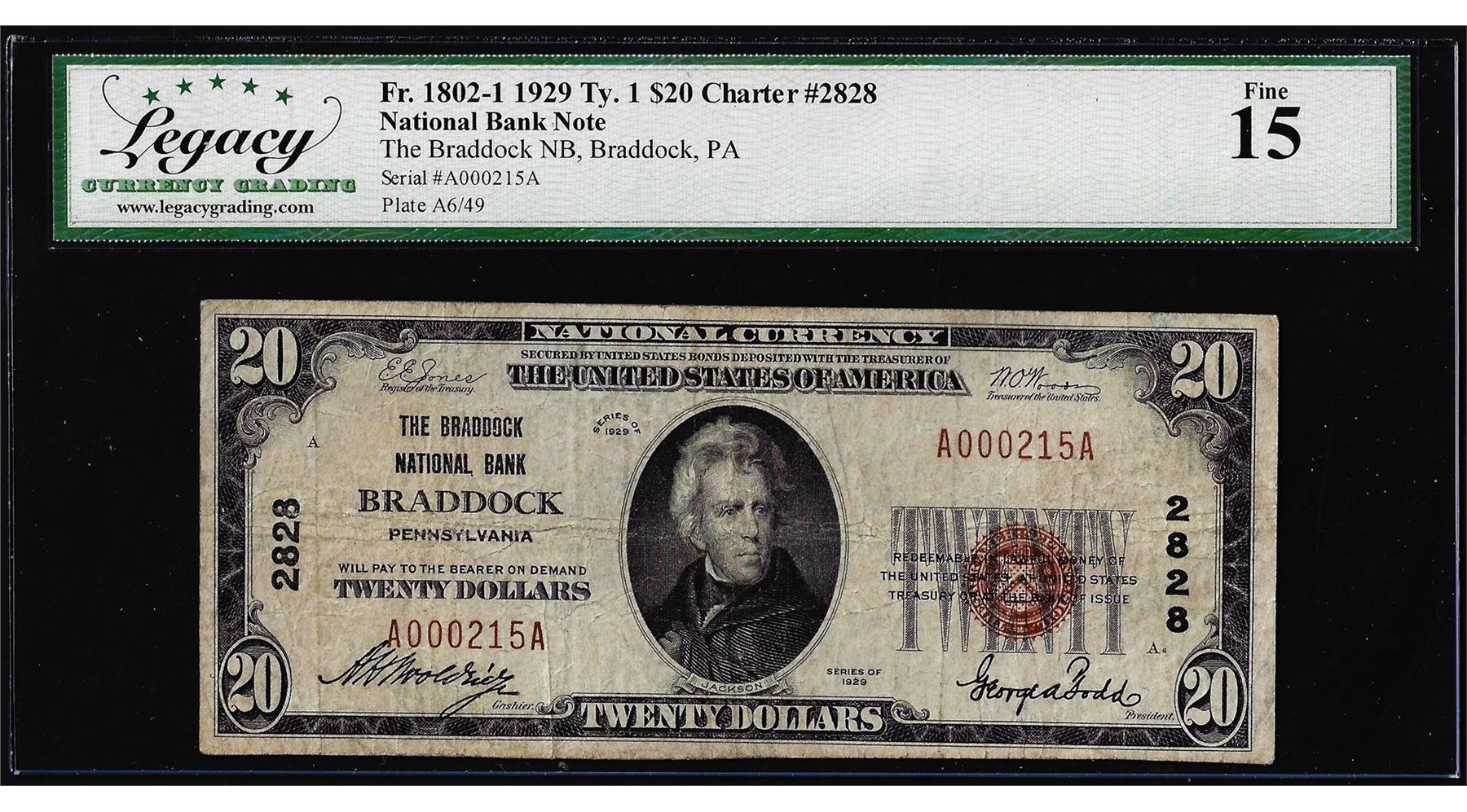 One 1929 $20 National Bank Braddock, PA CH# 2828 National Currency Note Legacy Fine 15. Legacy Graded.