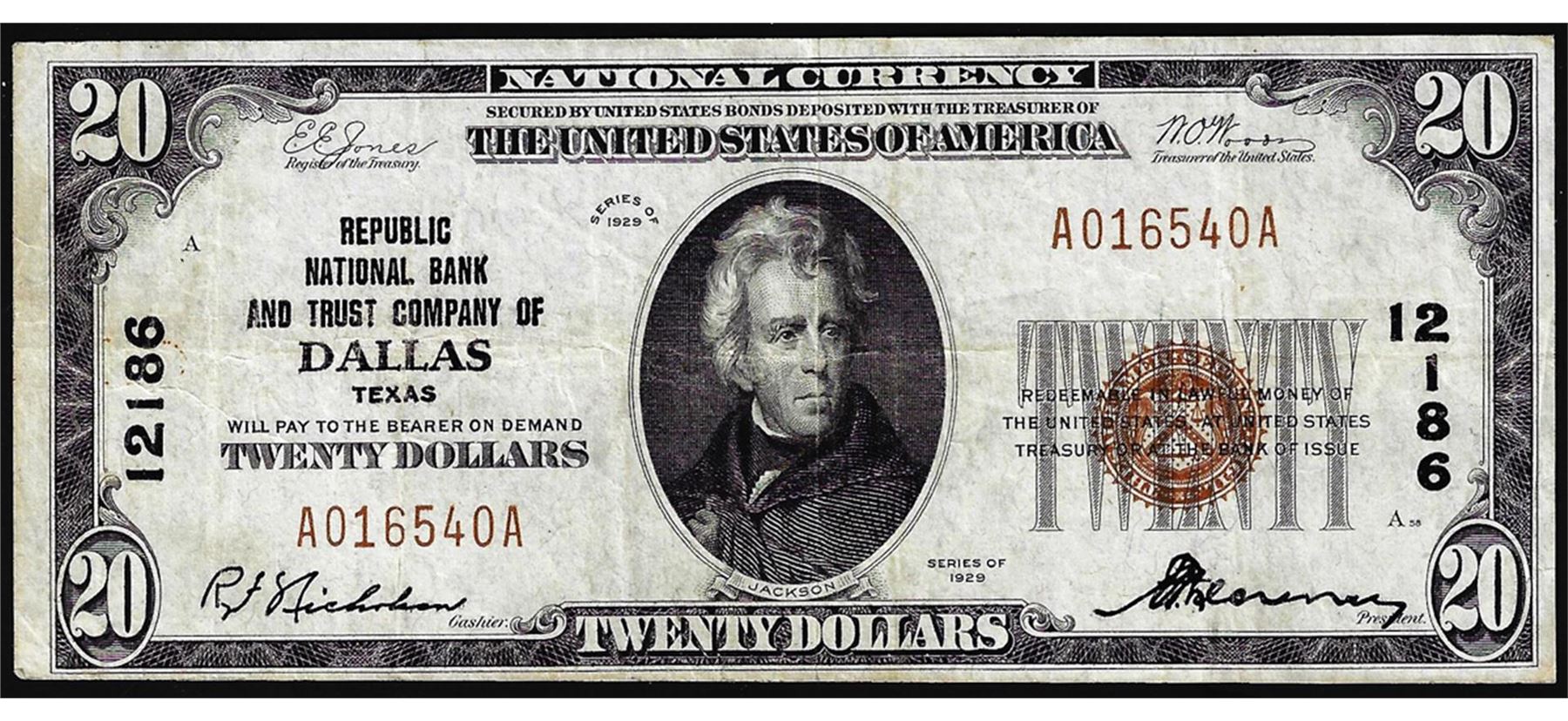 One 1929 $20 National Bank Dallas, TX CH# 12186 National Currency Note.