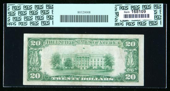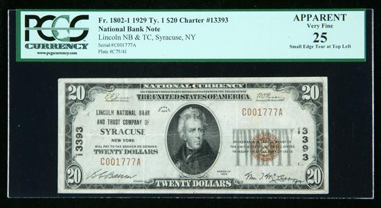 1929, $20 National Bank Note. Lincoln NB & TC, Syracuse, NY. PCGS Currency Apparent Very Fine 25. . Fr-1802-1. There is a small tear at the top left edge, otherise this note retains a decent appearance overall.