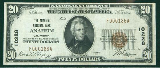 1929, $20 National Bank Note. The Anaheim NB, Anaheim,
