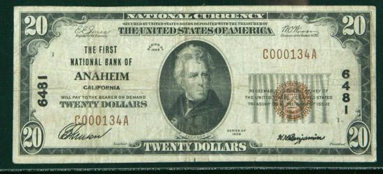 1929, $20 National Bank Note. The First NB, Anaheim, CA