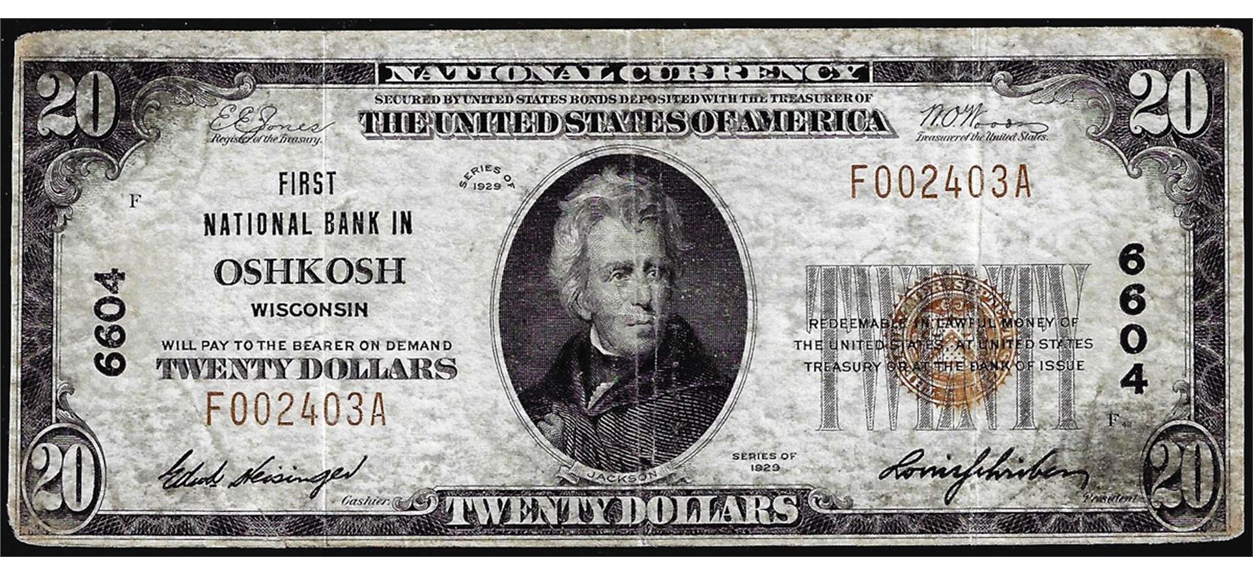 One 1929 $20 National Bank Oshkosh, WI CH# 6604 National Currency Note.