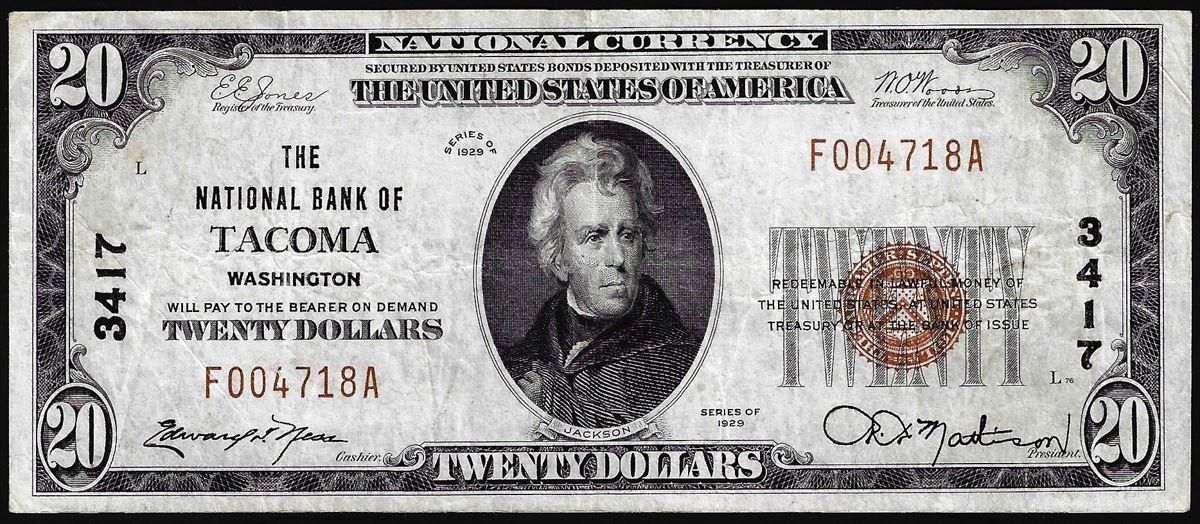 One 1929 $20 National Bank Tacoma, WA CH# 3417 National Currency Note.