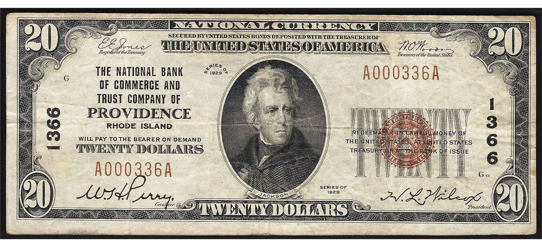 One 1929 $20 National Bank of Commerce & Trust Providence RI Currency Note CH# 1366.