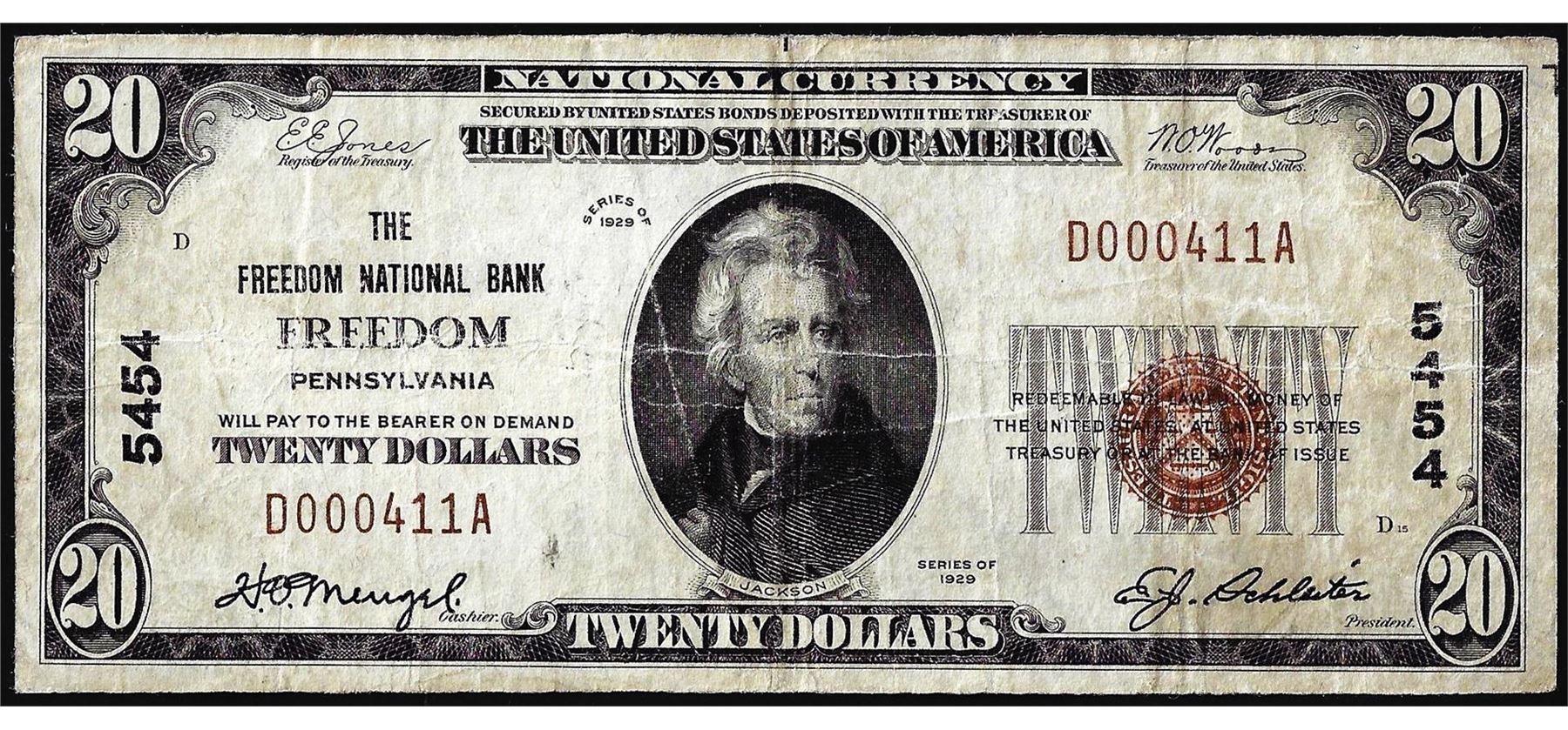 One 1929 $20 National Bank of Freedom, Pennsylvania CH# 5454 National Currency Note.